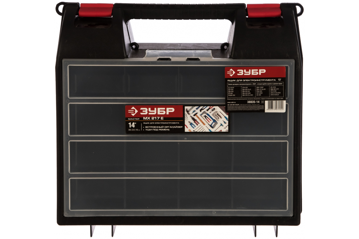 Ящик "МАСТЕР" Зубр 38035-14 используется при хранении и транспортировке мелкого инструмента и оснастки. Приспособление выполнено из прозрачного пластика, который отличается высокой прочностью, а благодаря прозрачной фактуре можно увидеть, какой именно инструмент в нем находится, не открывая для этого органайзер. Конструкция органайзера включает два запорных механизма для безопасности при хранении и переноске. Внутри ящика имеются отделения для мелочей, благодаря чему инструмент не перемешается и всегда будет под рукой.