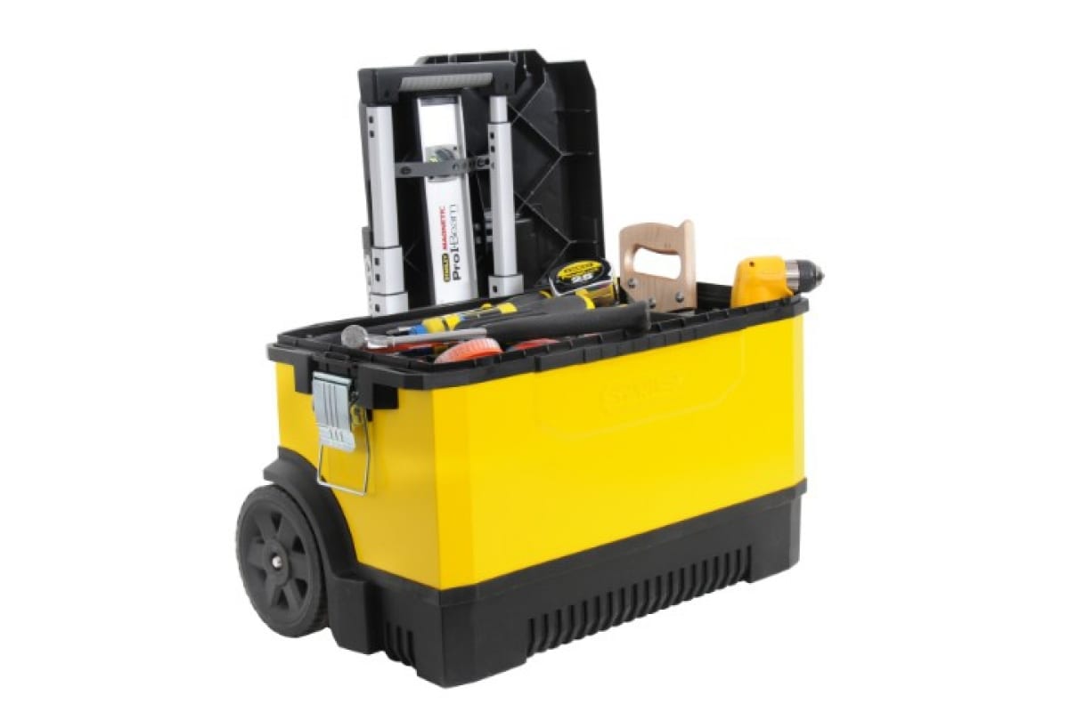 Ящик для инструмента с колесами Stanley 1-95-827 предназначен для хранения и удобной транспортировки инструментов. Большие металлические защелки надежно защищают ящик от непреднамеренного открывания. Можно отдельно приобрести и установить навесной замок. Инструментальный ящик применяется как в профессиональной сфере, так и в быту: он очень вместительный, помогает упорядочить нужные в работе предметы и всегда держать их под рукой. Ящик оснащен колесами диаметром 7" и телескопической ручкой для легкого перемещения. V-образный желобок на крышке необходим для удобной фиксации пиломатериалов.