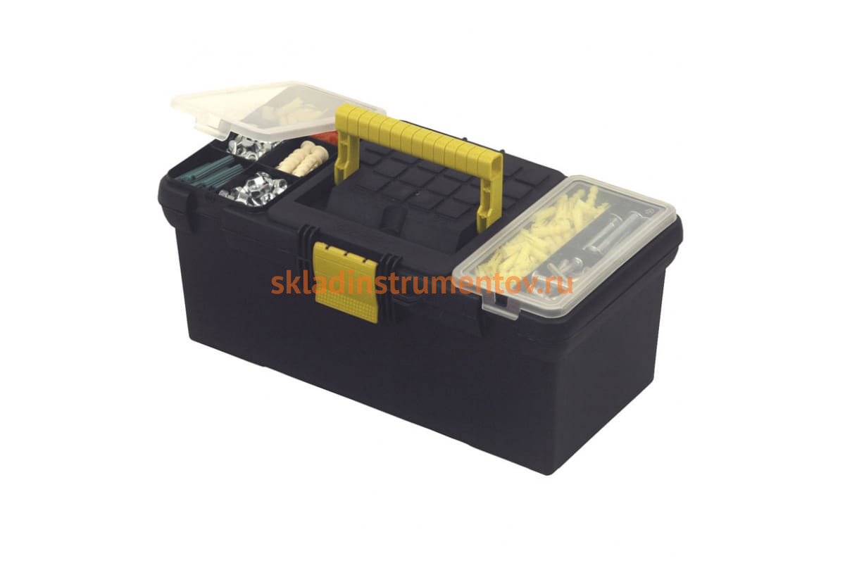 Ящик для инструмента Stanley 1-93-335 представляет собой контейнер для хранения часто используемого ручного инструмента и крепежа. Конструкция выполнена из пластика, имеет органайзер в крышке. Ручка и пластиковая защелка обеспечивают надежность и удобство переноски. Размер - 16".