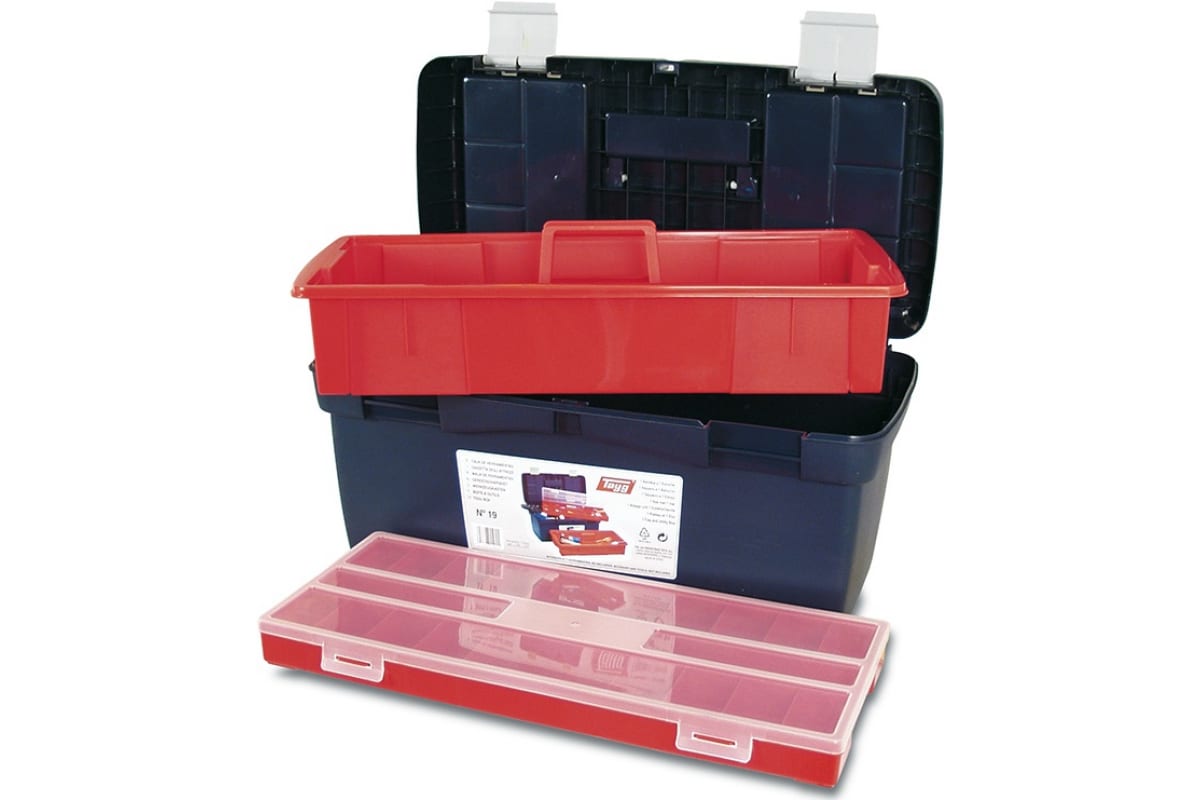 Ящик для инструментов с глубоким лотком + органайзер 58х29х29см №19 Tayg TAY-119002 широко распространен среди мастеров-любителей и профессионалов. Используется для хранения и транспортировки различных мелких предметов, ручных инструментов, метизов и пр. Ящик имеет общую крышку на двух замках, глубокий лоток с ручкой и съемный органайзер с прозрачной крышкой.