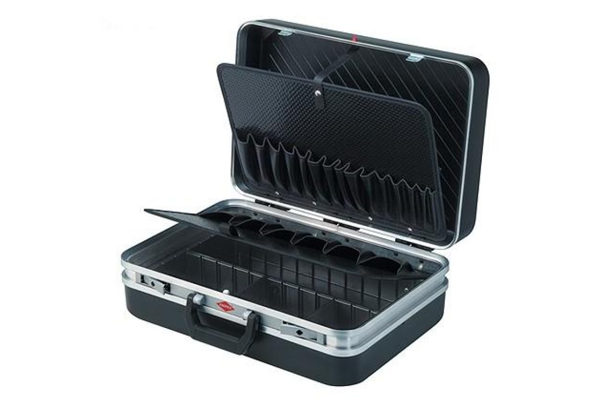 Инструментальный чемодан KNIPEX Vision24 пластмассовый, пустой KN-002120LE предназначен для хранения и переноски ручного инструмента и мелочей. Множество ячеек и отделений позволяет легко укомплектовать его необходимым инструментом: сверху в крышке находится съемная панель с 15 отделениями с одной стороны и с 6 большими отделениями и прижимной ячейкой (шириной 400 мм) со стороны крышки; снизу - поддон высотой 58 мм и съемная панель с 6 карманами. Панели изготовлены из легкого полипропилена Con-Pearl и крепятся к корпусу чемодана с помощью кнопок. Стильный черный чемодан имеет прочную конструкцию с двойной алюминиевой рамой по периметру и выдерживает нагрузку до 20 кг. Блокируется с помощью 2 замков и имеет удобную ручку для переноски.