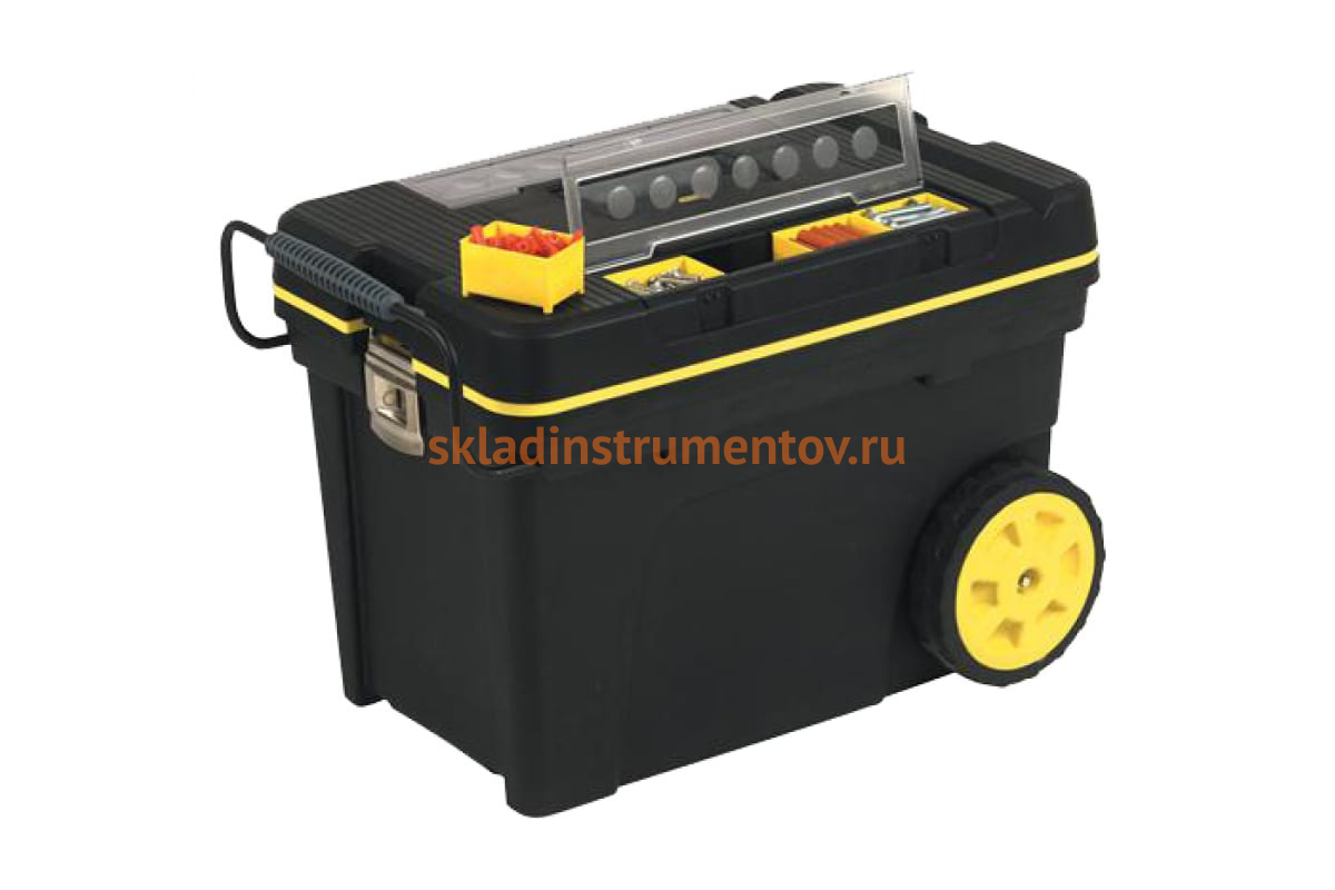 Ящик для инструмента с колесами Pro Mobile Tool Stanley 1-92-904 предназначен для хранения и удобной транспортировки инструментов. Мелкие детали можно удобно разместить в наружных отделениях, крупный инструмент - в объемном внутреннем отделении. Большие защелки надежно защищают ящик от непреднамеренного открывания. Инструментальный ящик применяется как в профессиональной сфере, так и в быту: он очень вместительный, помогает упорядочить нужные в работе предметы и всегда держать их под рукой. Ящик оснащен колесами и выдвижной ручкой для легкого перемещения, а также четырьмя складными крюками для фиксации оборудования эластичным шнуром.
