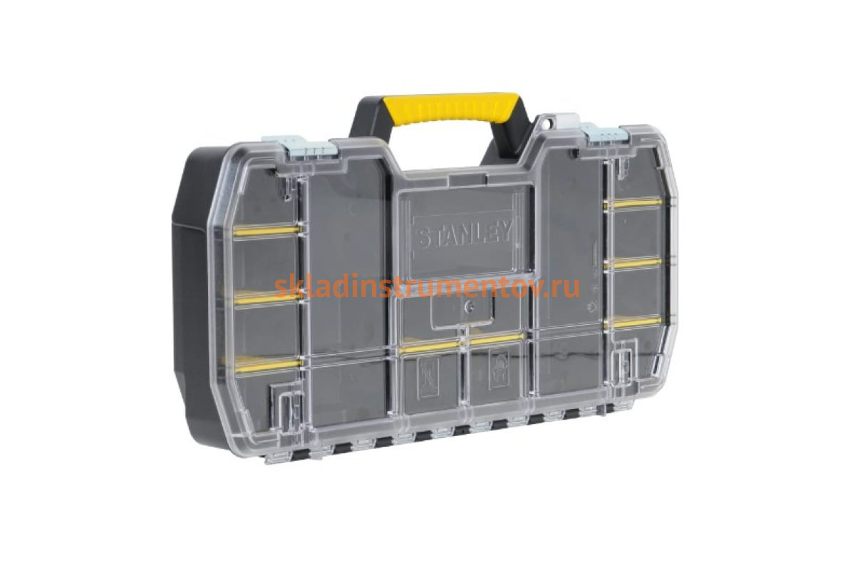 Органайзер с металлическими замками 19" Stanley STST1-70736 1-70-736 применяется для хранения мелких деталей. Имеет съемные перегородки и прочную прозрачную крышку. За счет Г-образного отделения возможно размещение инструмента изогнутой формы. Для удобства переноски предусмотрена интегрированная ручка. Замки выполнены из металла и защищены от ржавления.