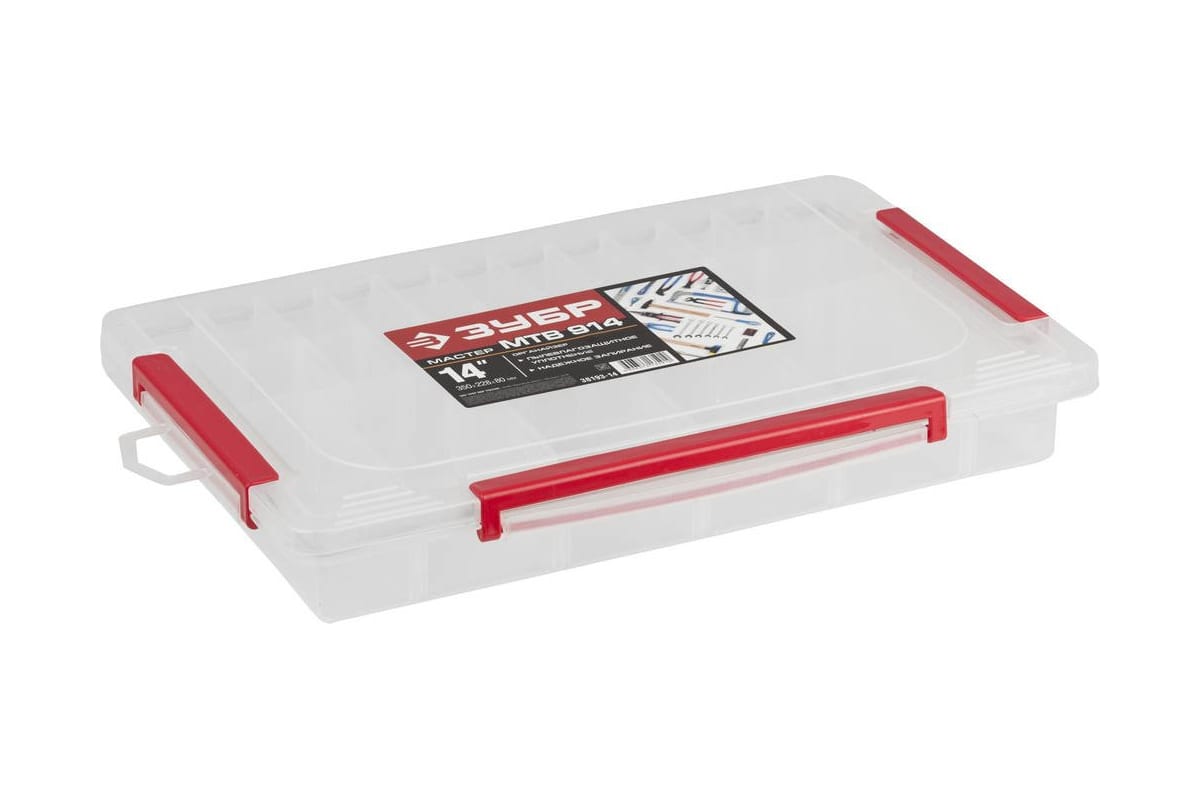Органайзер для крепежа и принадлежностей 14" Зубр МАСТЕР 38193-14 - иделаьный вариант для хранения меких предметов, метизов и т.д. дома или в мастерской. Крышка защищена от случайного открытия благодая трехстороннему запиранию. Внутри органайзера расположена специальная уплотнительная резинка для препятствия попаданию внутрь пыли и влаги.
