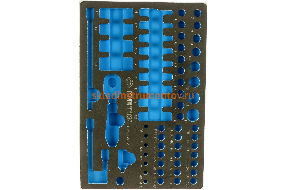 Ложемент для наборов торцевых головок 2565MRV, 9-2565MRV, EVA KING TONY 85811132B выполнен из прочного пластика. Материал устойчив к несильным ударам, не крошится и не распадается при длительной эксплуатации.
