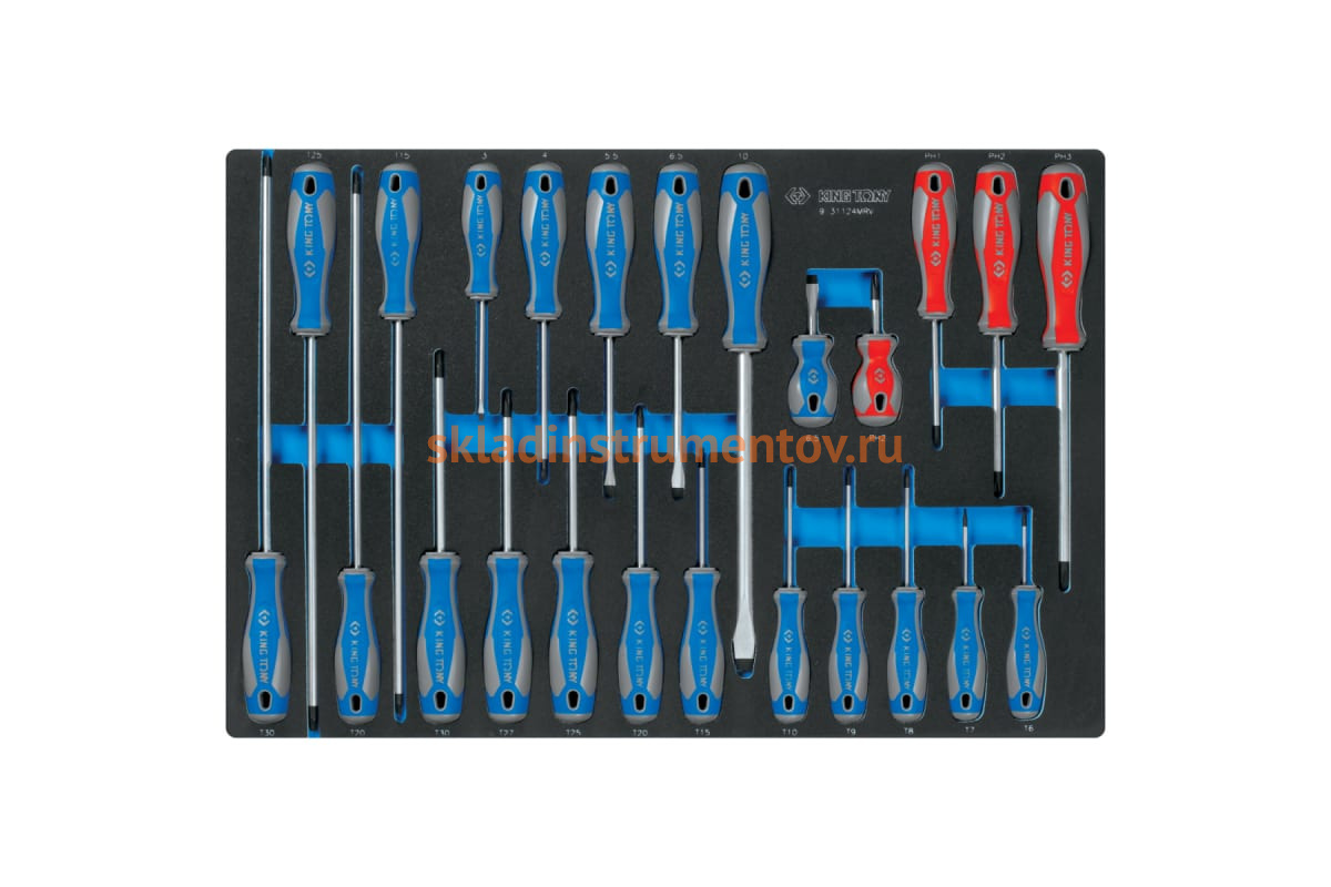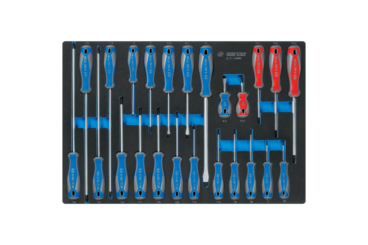 Ложемент для набора отверток 9-31124MRV, EVA KING TONY 85810932B выполнен из прочного пластика. Материал устойчив к несильным ударам, не крошится и не распадается при длительной эксплуатации.