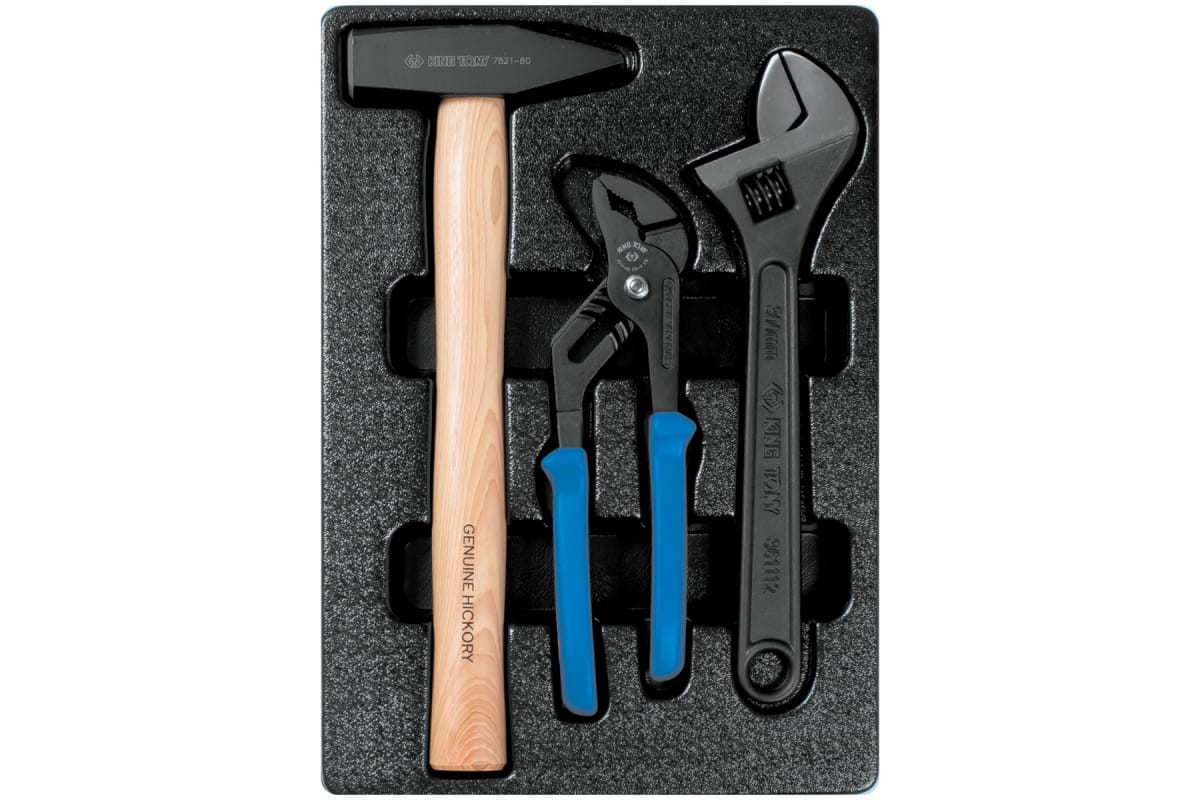 Ложемент для набора переставные клещи, разводной ключ и молоток 9-90103PP02, PVC KING TONY 84710520B выполнен из прочного пластика. Материал устойчив к несильным ударам, не крошится и не распадается при длительной эксплуатации.