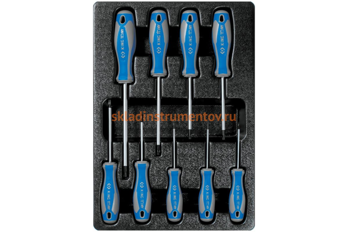 Ложемент для набора отверток 9-31909PR, PVC KING TONY 84714720B выполнен из прочного пластика. Материал устойчив к несильным ударам, не крошится и не распадается при длительной эксплуатации.