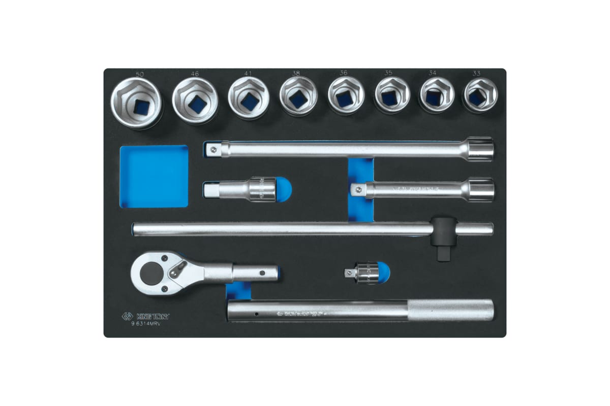 Ложемент для набора торцевых головок 9-6314MRV, EVA KING TONY 85813532B выполнен из прочного пластика. Материал устойчив к несильным ударам, не крошится и не распадается при длительной эксплуатации.