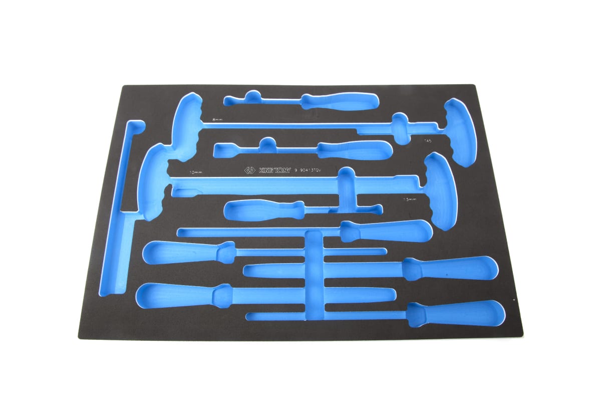 Ложемент для набора напильников, торцевых отверток, съемники клипс и металлическая щетка KING TONY 85811032B изготовлен из легкого, прочного и упругого материала EVA. Имеет высокую устойчивость к маслам и растворителям, а так же возвращает свою прежнюю форму при деформации.
