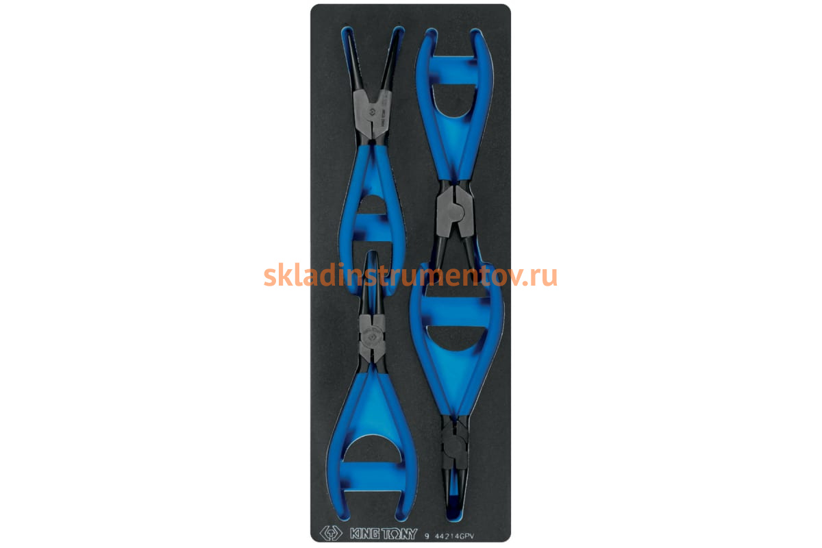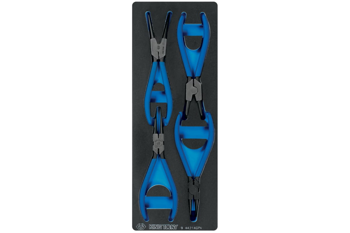 Ложемент для набора съемников стопорных колец 9-44214GPV, EVA KING TONY 85810832B выполнен из прочного пластика. Материал устойчив к несильным ударам, не крошится и не распадается при длительной эксплуатации.