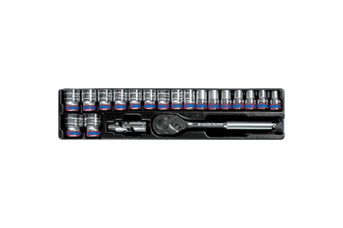Ложемент для набора торцевых головок 9-4319MR, PVC KING TONY 84730120B выполнен из прочного пластика. Материал устойчив к несильным ударам, не крошится и не распадается при длительной эксплуатации.