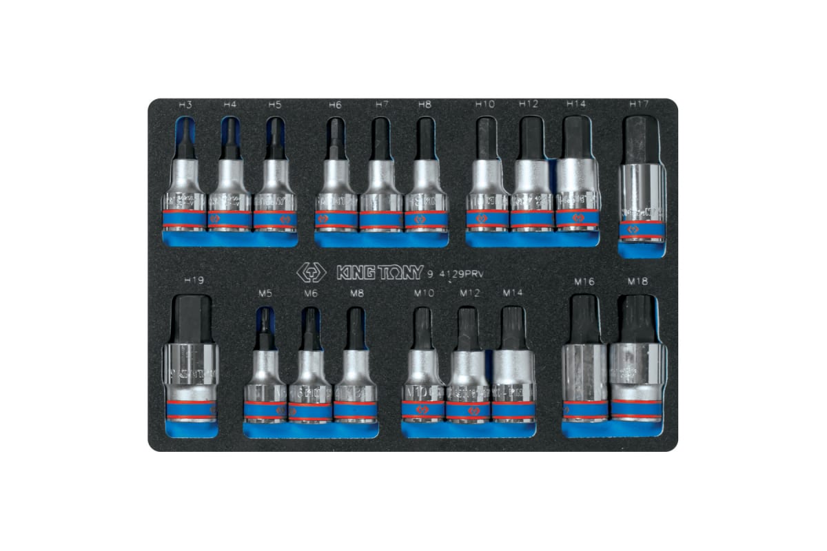 Ложемент для набора торцевых насадок 9-4129PRV, EVA KING TONY 85811232B выполнен из прочного пластика. Материал устойчив к несильным ударам, не крошится и не распадается при длительной эксплуатации.