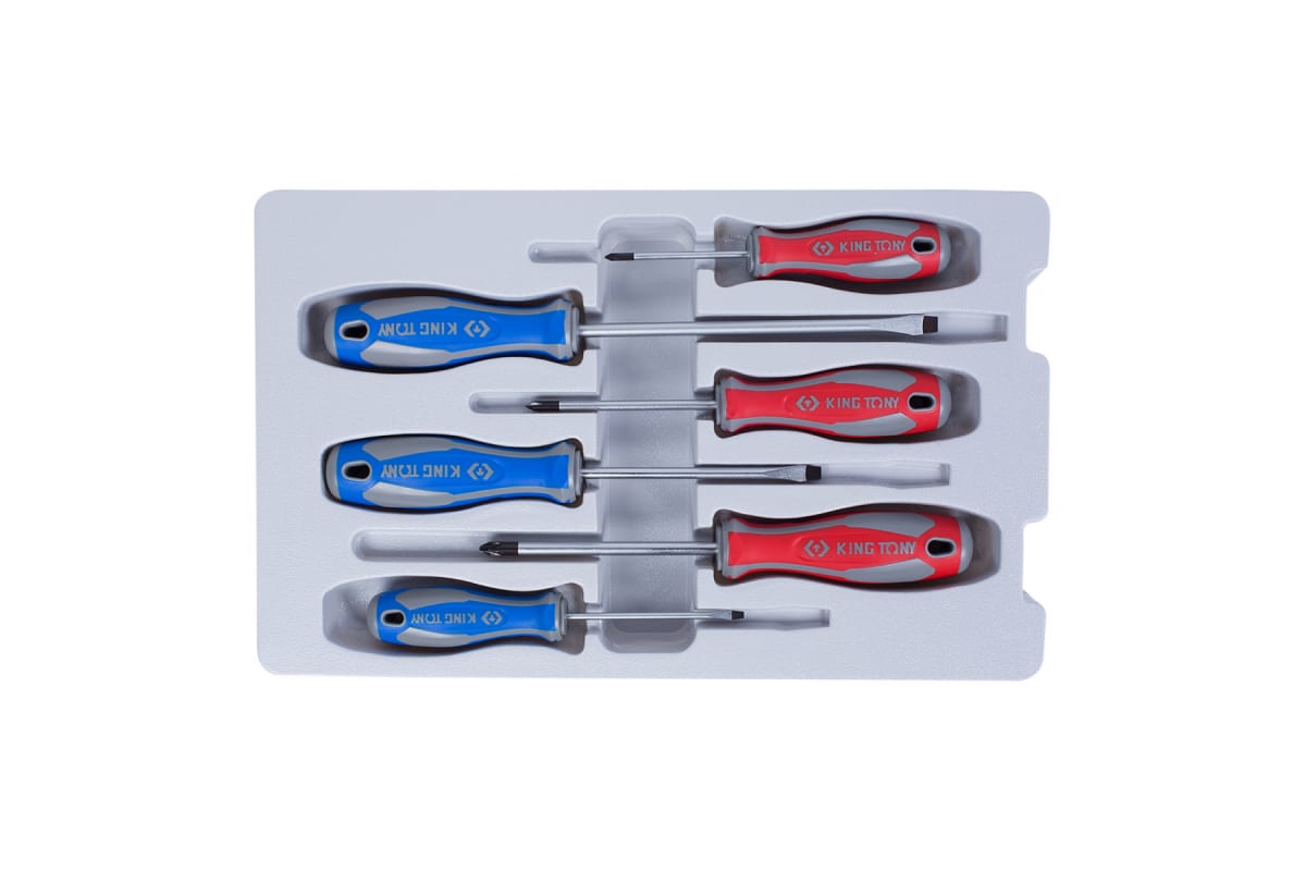 Ложемент для наборов отверток 31116MR, 31116MR01, 31216MR, 30316PR, 30206MR, PVC KING TONY 843020612H выполнен из прочного пластика. Материал устойчив к несильным ударам, не крошится и не распадается при длительной эксплуатации.