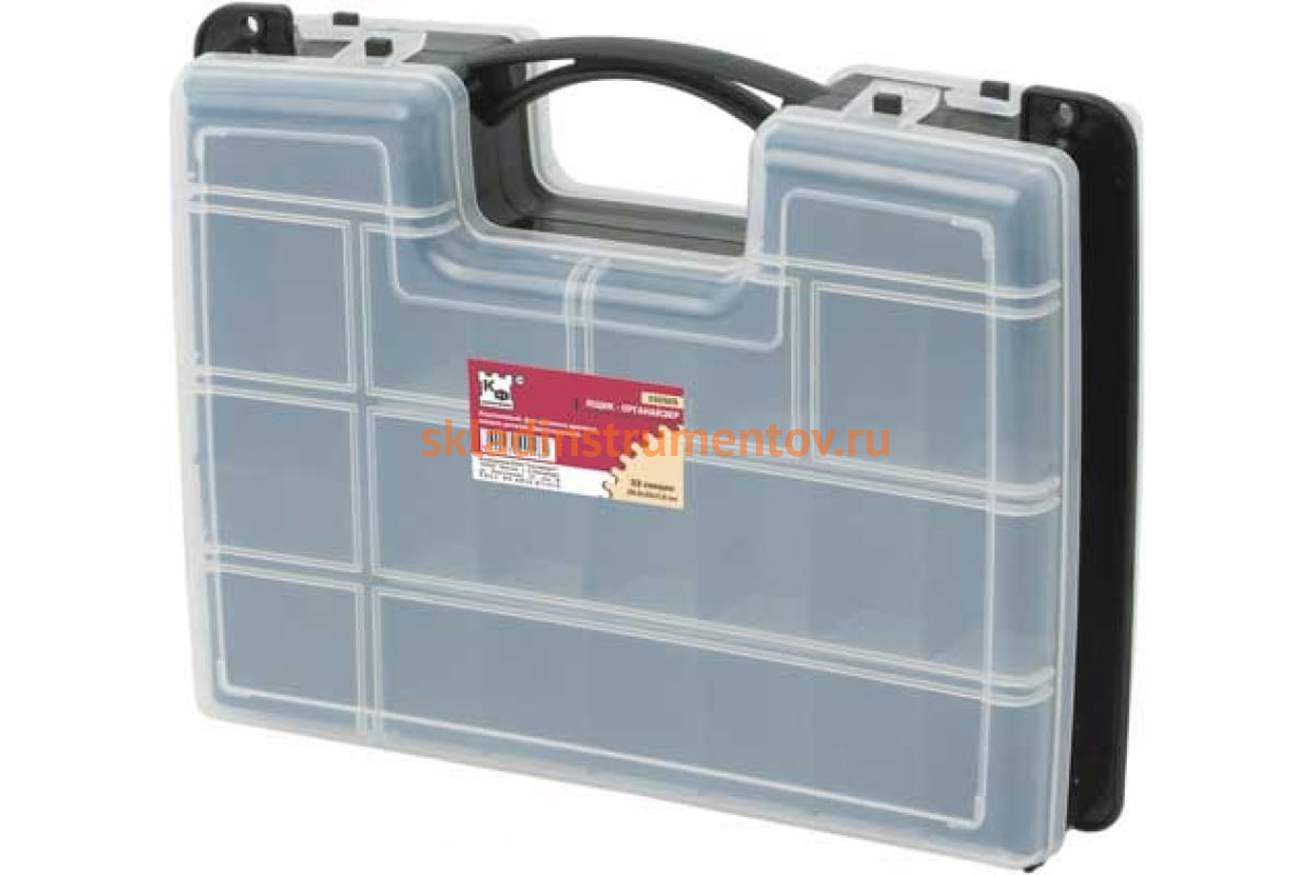 Двухсторонний органайзер Контрфорс 150505 выполнен в форме кейса, служит для хранения и переноски крепежа и мелких деталей. Состоит из 32 отделений, где удобно размещаются необходимые аксессуары и различные мелочи. Прозрачная крышка позволяет видеть расположение крепежа внутри. Пластиковые защелки надежно защищают чемоданчик от непреднамеренного открывания.