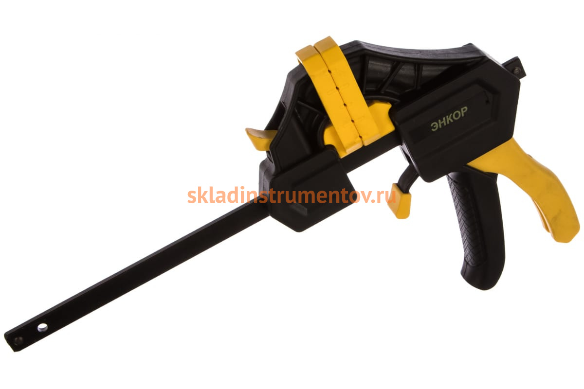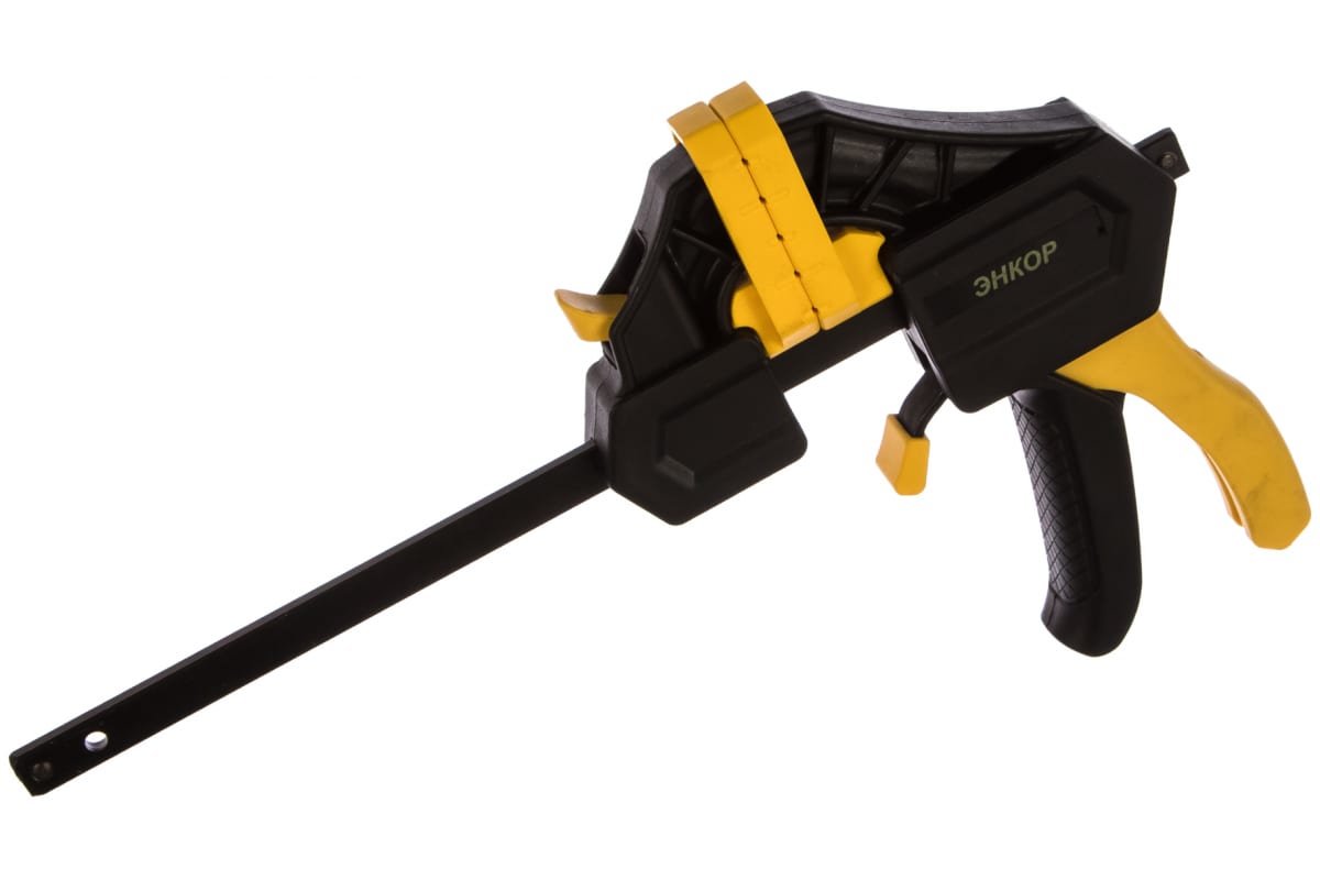 Струбцина (ручная, пистолетная) 150мм Энкор 48430 применяется для сжатия нескольких деталей между собой. Благодаря простому механизму обеспечивается высокая эффективность. Одна из губок скользит по стальному стержню, что гарантирует необходимую прочность как при фиксации деталей, так и использовании инструмента в виде распорки.