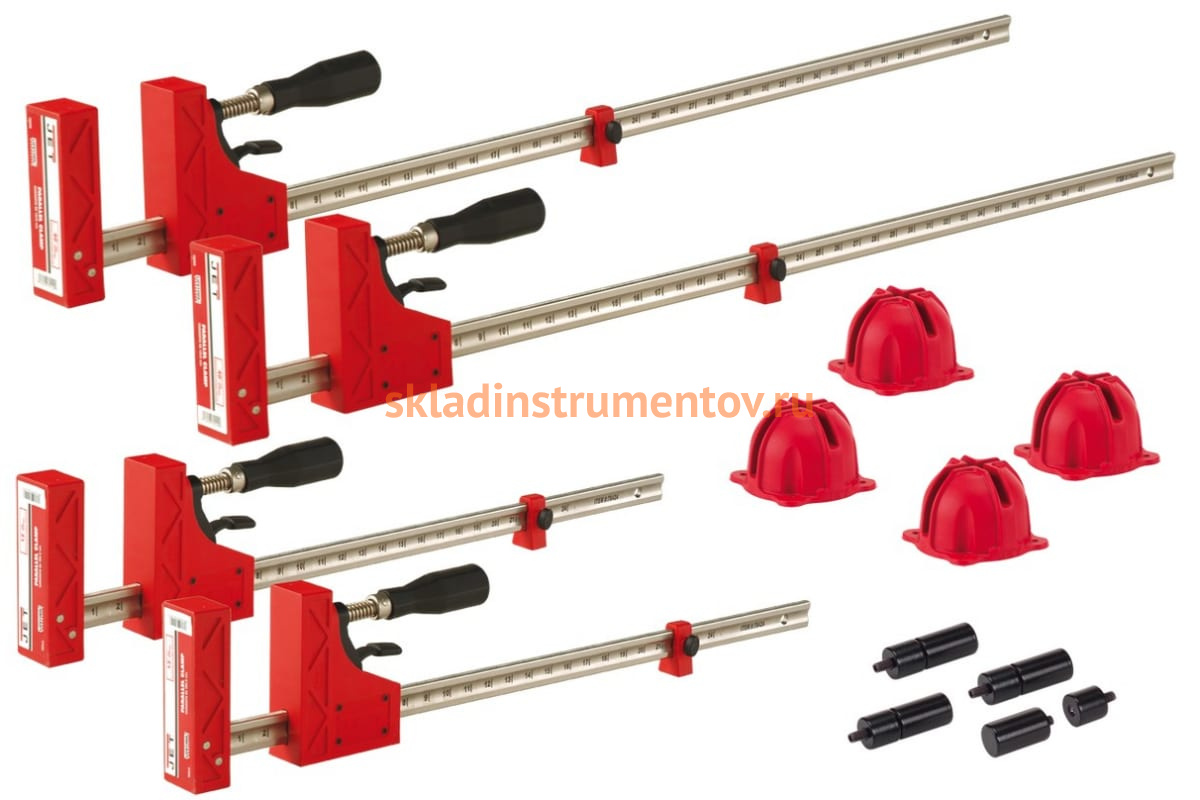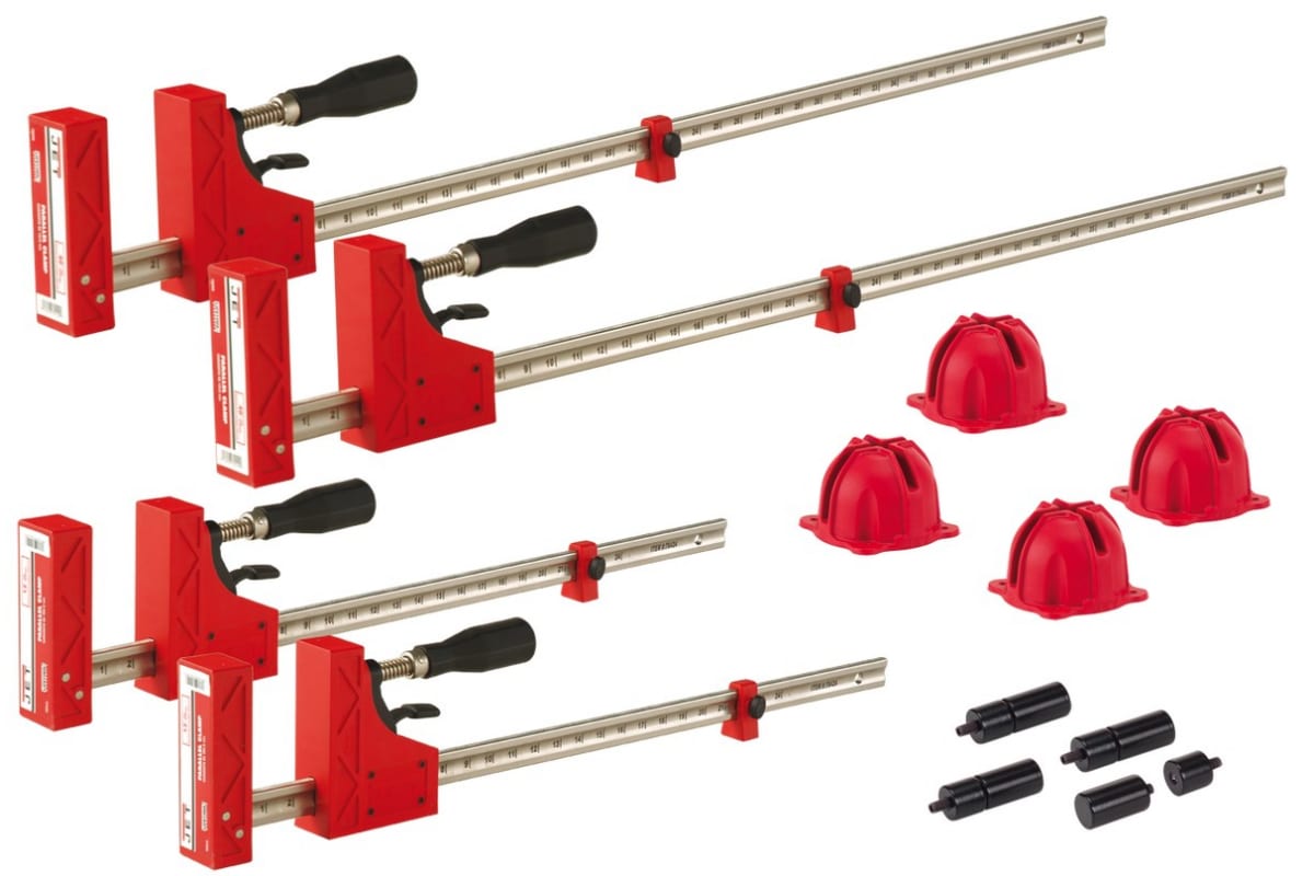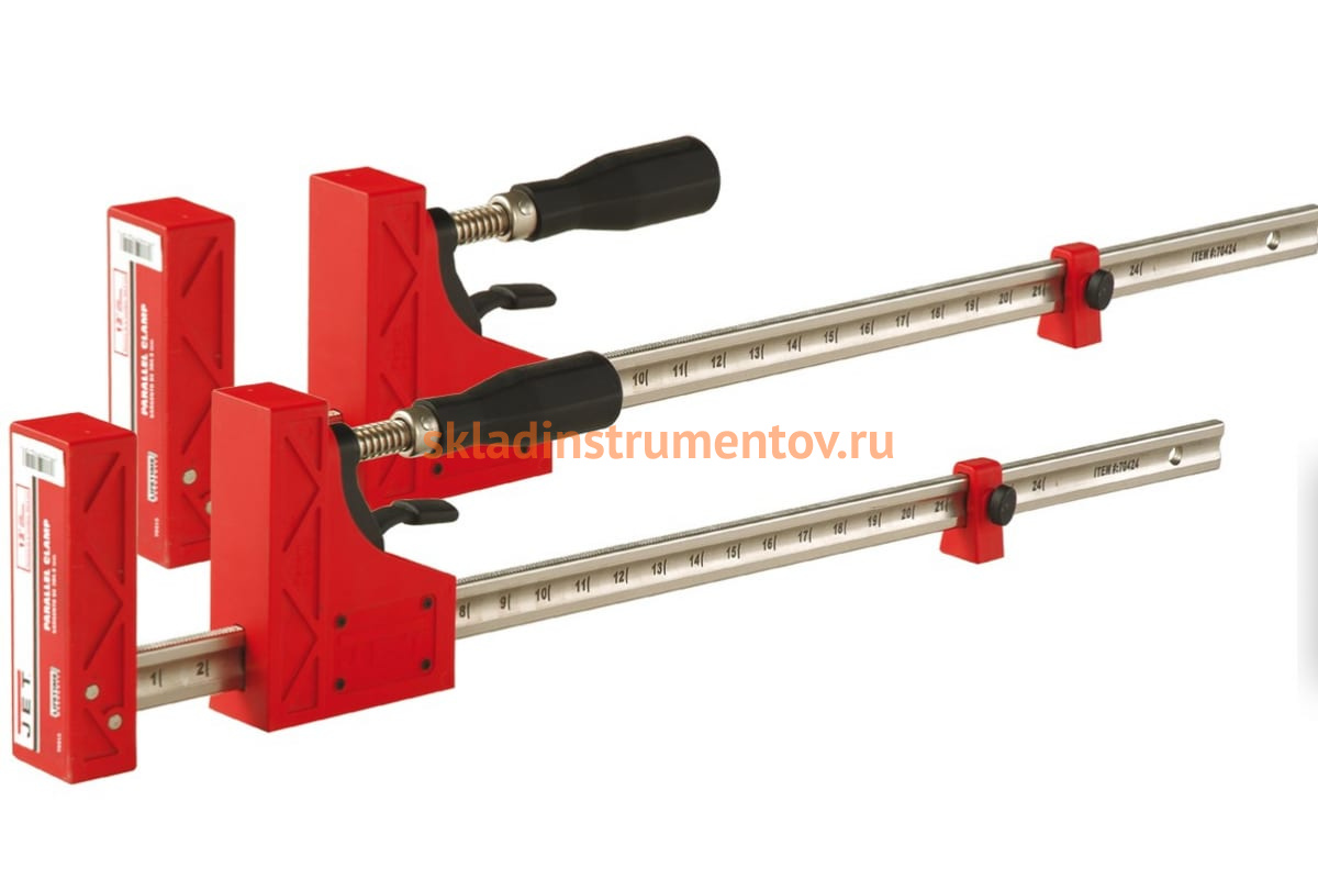 Набор корпусных струбцин и принадлежностей (12 предметов, 1000мм и 610мм) JET 70411EU используется для работы в столярных мастерских для сборки конструкций на клею из деревянных деталей. Представленный комплект включает в себя четыре корпусных струбцины и вспомогательные приспособления для простой, удобной и эффективной работы.