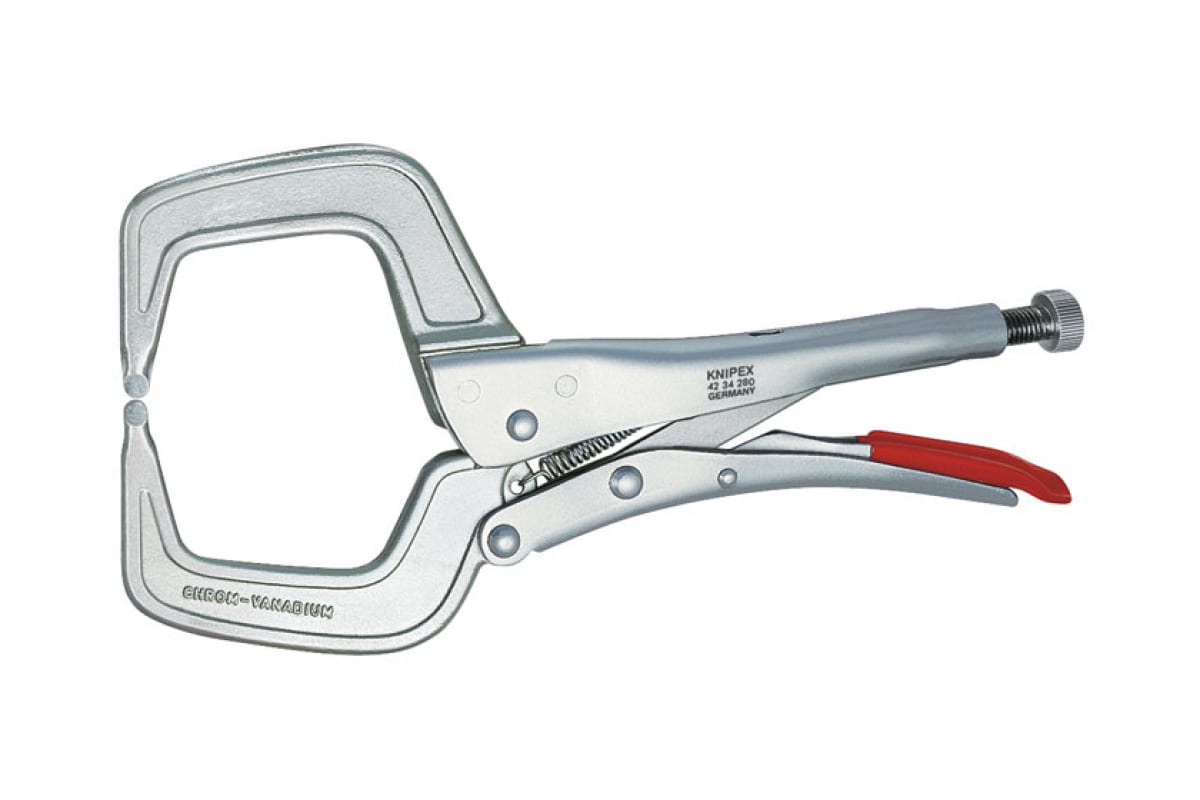 Сварочные зажимные клещи KNIPEX KN-4234280 - высокопрочный зажимной инструмент, рассчитанный на большие механические нагрузки. Предназначен для фиксации профилей с высотой ребра до 40 мм. Рабочая часть и рукоятки имеют никелевое покрытие, которое обеспечивает высокую антикоррозионную стойкость и поверхностную твердость. Для быстрой настройки зева на необходимый размер предусмотрен регулировочный винт. Конструкция рукоятки клещей позволяет снять с руки значительную часть нагрузки при проведении работ. Это дает возможность работать одной рукой.