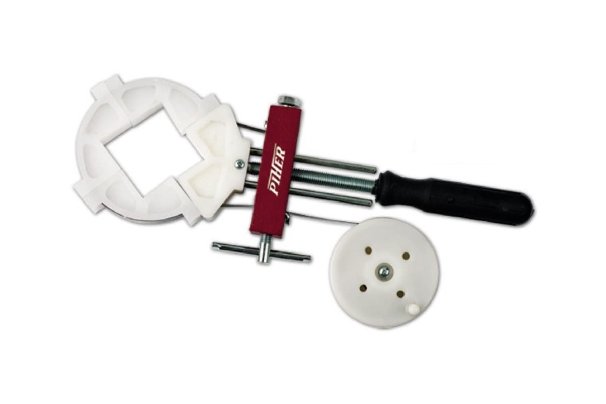Ленточный зажим для четырёхугольных конструкций Piher A 24002 имеет чугунное основание. Надежная фиксация деталей осуществляется при помощи нейлоновых углов и стальной закаленной ленты CK67S. Основным преимуществом модели является равномерное распределение давления ленты при фиксации детали, что предотвращает деформацию ее поверхности. Рукоятка имеет рельефную форму для удобного захвата. Вес зажима составляет всего 1.29 кг. Устройство просто в эксплуатации и не требует специального обслуживания.