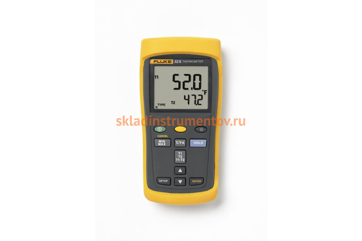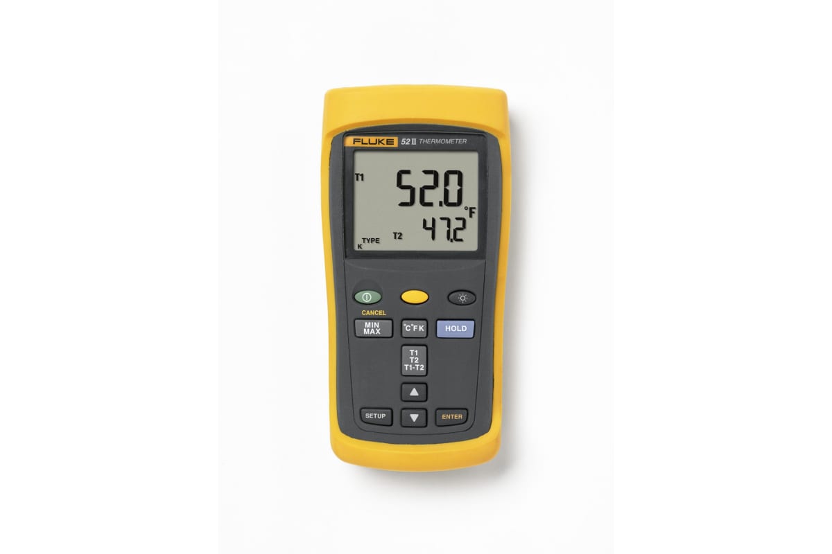 Термометр FLUKE 52-2 прост и удобен в использовании. Подходит для измерения двух контактных температурных входов одновременно на двигателях, изоляции, выключателях, проводах при помощи термопар промышленного стандарта типа J, K, T или E.