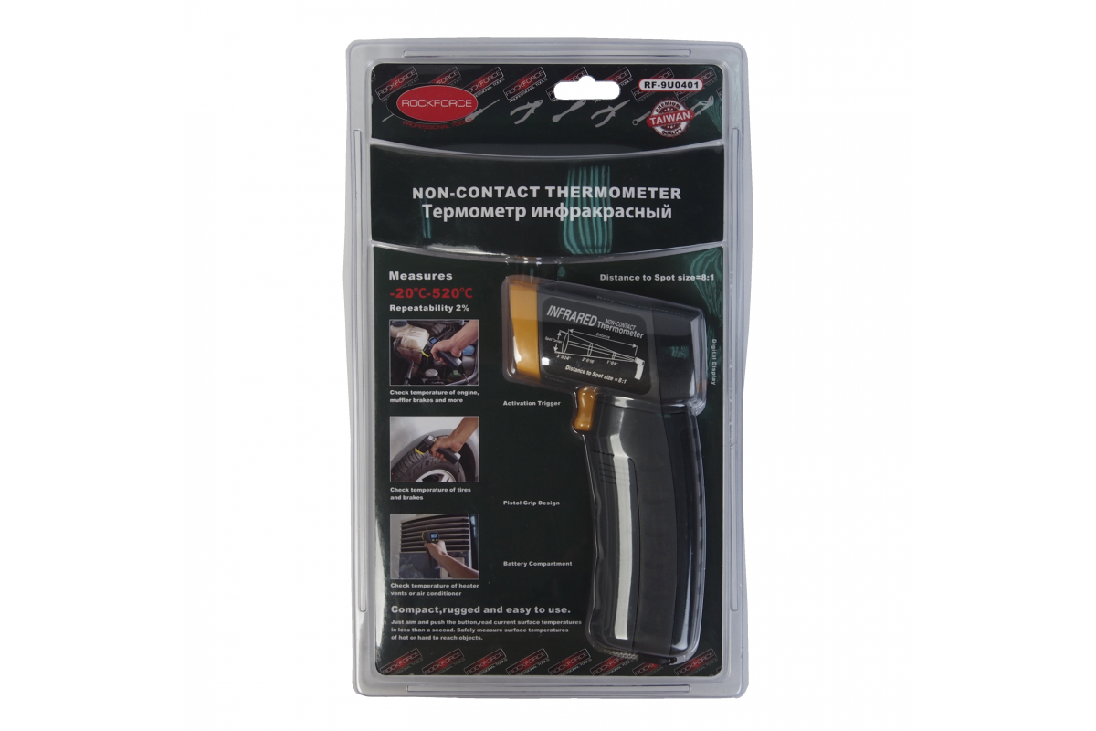 Инфракрасный термометр ROCKFORCE RF-9U0401 имеет пистолетную форму для максимального удобства в применении.