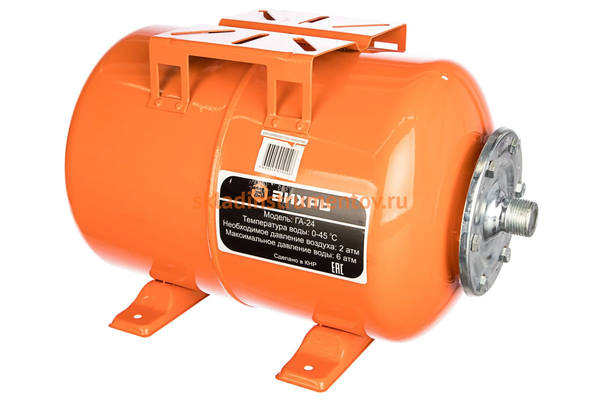 Гидроаккумулятор ГА-24 Вихрь 68/6/1 рекомендуется использовать со скважинными (до 500 Вт) или поверхностными насосами мощностью до 1 кВт. Гидроаккумулятор выступает в роли накопителя воды, а также отвечает за поддержание нужного давления воды и компенсирует его перепады в системе водоснабжения. Если такой прибор установлен, то насос включается не каждый раз при открытии крана, что значительно повышает его ресурс. Корпус и фланец агрегата выполнены из стали, что обеспечивает ему надежность и защиту от коррозии, сменная мембрана - из пищевой резины. Необходимая модель гидроаккумулятора выбирается в зависимости от мощности и объема потребляемой воды насосом.