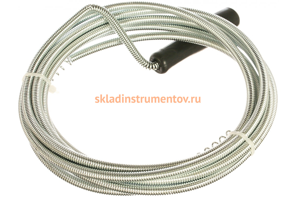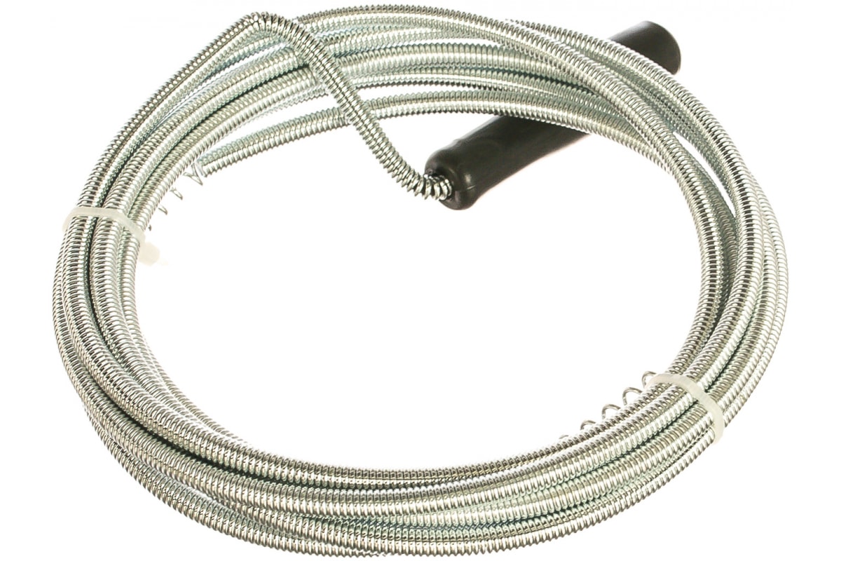 Приспособление для прочистки труб РемоКолор диаметр 6 мм, длина 3 м 61-0-003 представляет собой прочный и гибкий стальной трос в пружинной оплетке с пластиковой рукояткой.