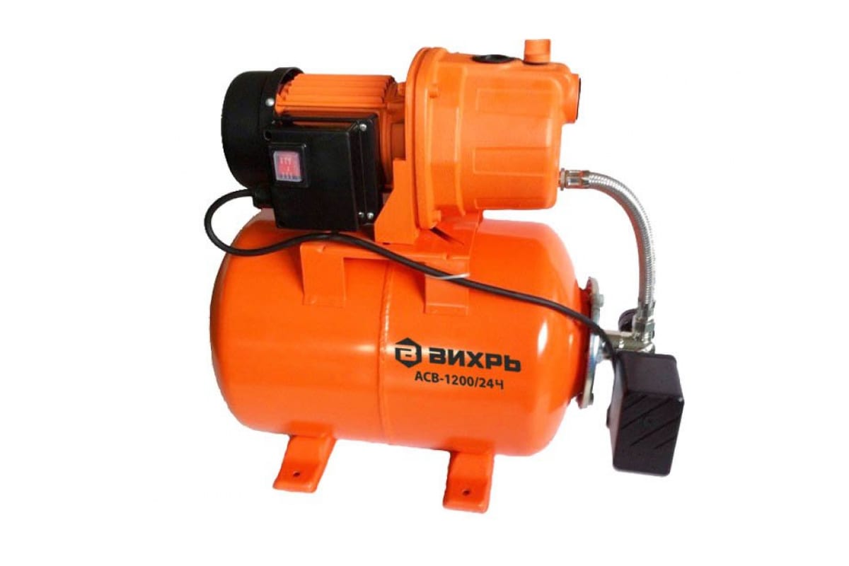 Насосная станция Вихрь АСВ-1200/24Ч 68/1/9 - устройство для автономного водоснабжения дач, домов и ферм. Имеет стальной резервуар на 24 литра, который служит для сглаживания гидроударов.