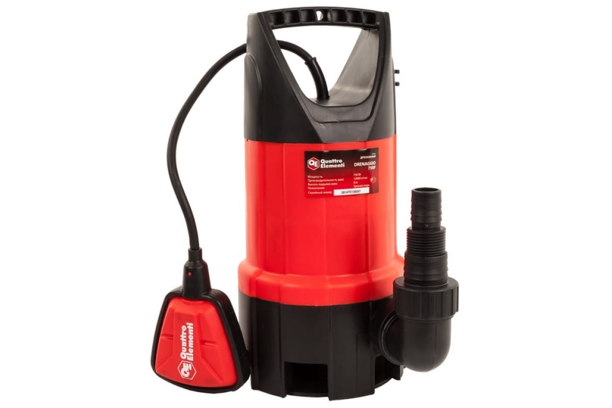 Дренажный насос QUATTRO ELEMENTI Drenaggio 750 F 771-558 предназначен для откачивания жидкости. Оснащен электродвигателем мощностью 750 Вт, который обеспечивает производительность до 12000 л/ч. Насос данной модели способен работать в среде с твердыми частицами размером до 35 мм. Например, выкачивать жидкость из затопленных помещений. Поплавковый механизм обеспечивает автоматическую работу насоса.