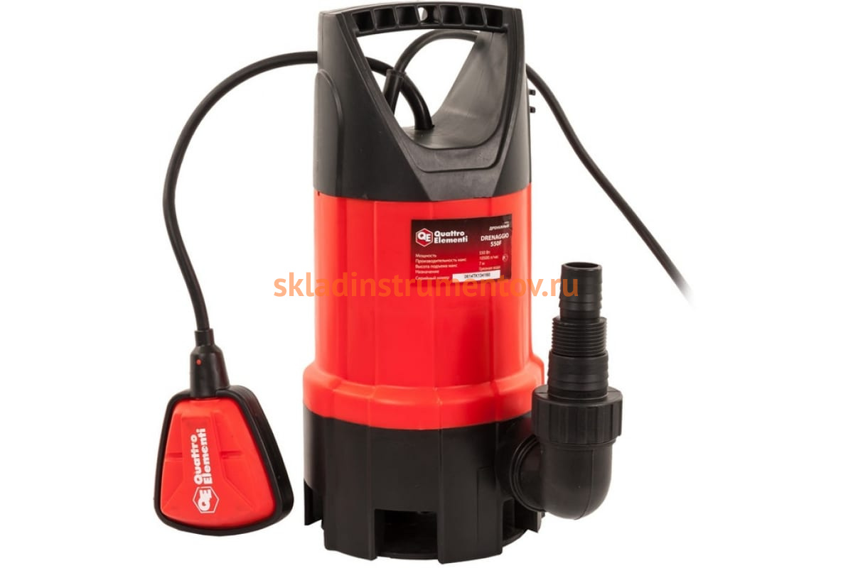 Дренажный насос QUATTRO ELEMENTI Drenaggio 550 F 770-711 отличается высокой производительностью. Используется для перекачивания загрязненной воды. Максимальный диаметр твердых частиц - 35 мм. Поплавковый выключатель повышает срок службы насоса, так как он отслеживает уровень воды и предотвращает работу всухую. Корпус изготовлен из пластика и обладает износостойкостью.