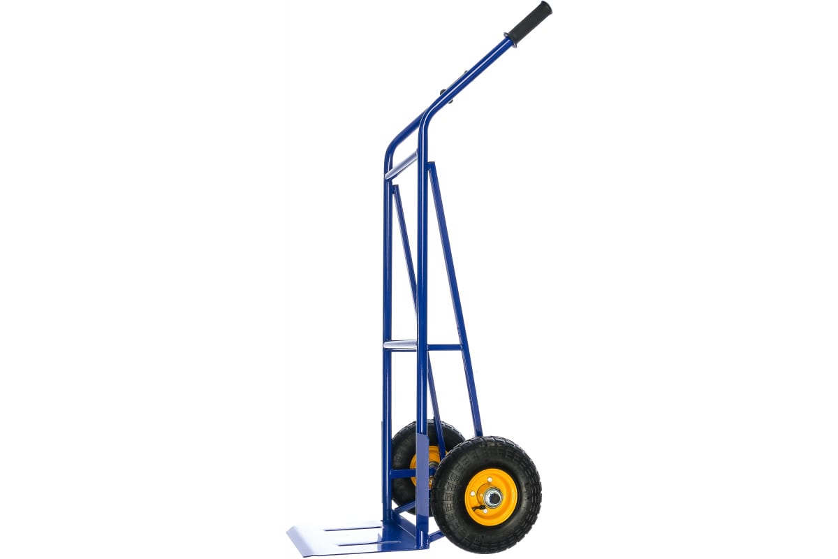 Прочная конструкция с каркасом из труб и двумя пневматическими колесами, окрашена полимерной порошковой краской, что позволяет использовать приспособление на открытом воздухе даже при неблагоприятных погодных условиях. Тележка широко распространена для эксплуатации в профессиональной сфере - на складах, производственных предприятиях и т. д.