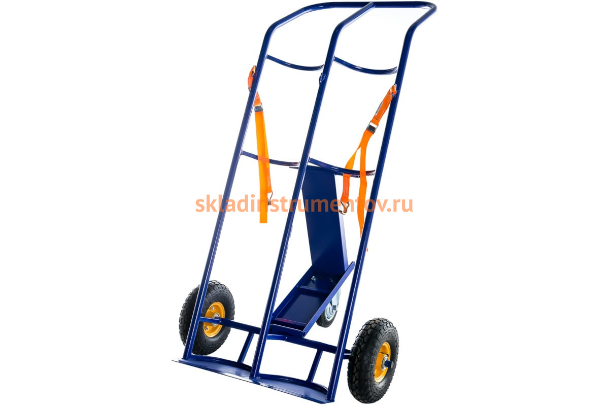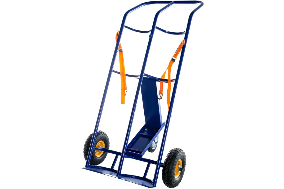Тележка RUSKLAD КП 2 обладает прочной металлической конструкцией с ручками, двумя пневматическими колесами диаметром 250 мм и одним дополнительным опорным колесом диаметром 160 мм. Изделие служит для транспортировки двух баллонов (пропан и кислород). Груз фиксируется на тележке при помощи ремня.