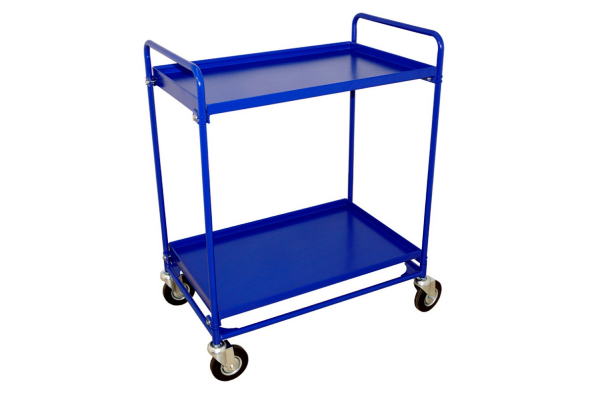 Сервисная двухъярусная тележка RUSKLAD СТ 3 изготовлена из прочного металла. Изделие подойдет для перевозки сухого белья, чистящих средств или подносов в столовых. Конструкция состоит из ручек, двух полок с бортиками 30 мм и четырех колес диаметром 125 мм.