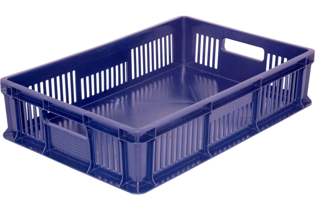 Ящик с ручками Тара.ру 600х400х140 мм, синий 17298 используется для хранения и транспортировки товара в зонах производства. Изготовлен из 100% первичного полиэтилена (HDPE). Имеет объем 27 л. Перфорированные стенки обеспечивают циркуляцию воздуха для сохранения свежести продуктов.