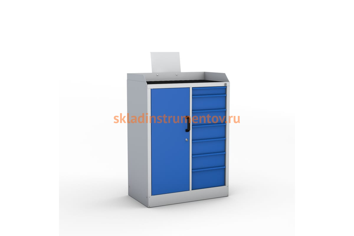 Шкаф имеет две секции. Одна из них с дверцей, оснащена 3-мя полками из ОЦ стали, выдерживающими нагрузку 100 кг. Полки регулируются по высоте. Секция с выдвижными ящиками имеет 7 ящиков. Они установлены на направляющих полного выдвижения. Нагрузка на ящики 30-50 кг. Все они имеют общую систему запирания. Столешница имеет защитный коврик, а также оснащена отбортовкой, предотвращающая падения инструмента.