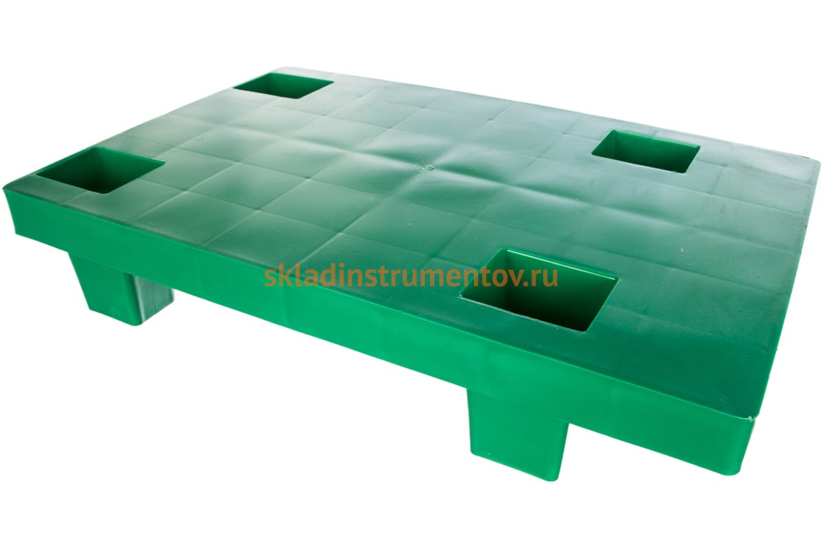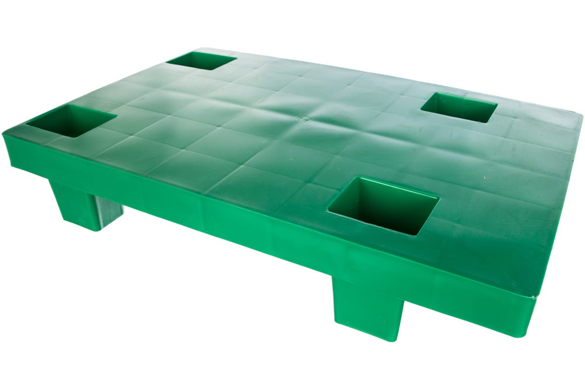 Сплошной паллет на ножках, зеленый, 600х400х130 мм Тара.ру 15754 применяется на складах и выдерживает значительную нагрузку.