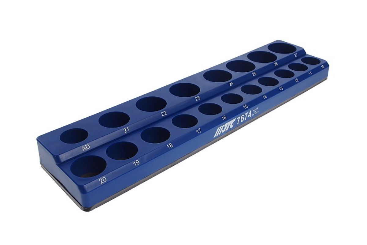 Магнитный держатель JTC JTС-7674 используется для хранения и удобной транспортировки торцевых головок размером 10-27 мм с посадочным квадратом 1/2". Данное приспособление имеет магнитное основание, что позволяет крепить его на любой металлической поверхности. Держатель оснащен гнездами для 18 стандартных головок и для 1 адаптера.