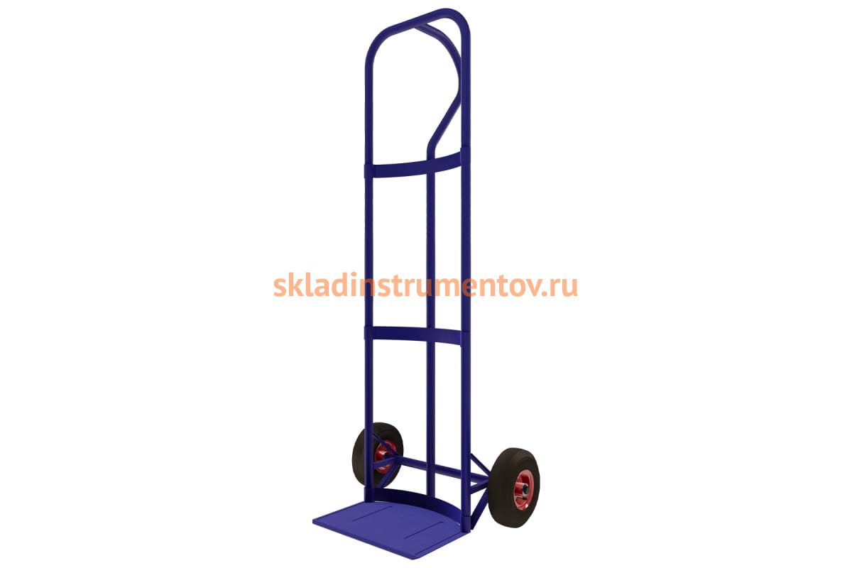 Прочная конструкция с каркасом из труб и двумя литыми колесами, окрашена полимерной порошковой краской, что позволяет использовать приспособление на открытом воздухе даже при неблагоприятных погодных условиях.