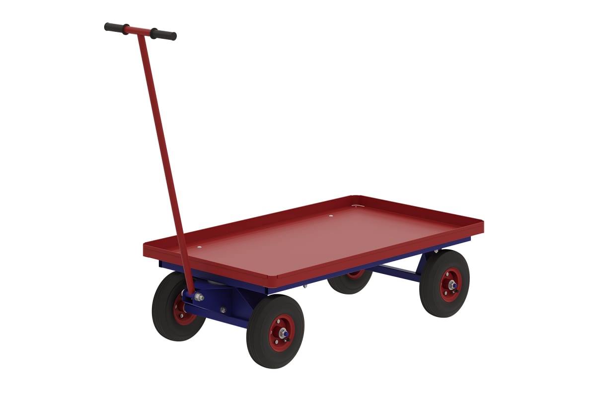 Для удобства перемещения негабаритного оборудования товаров возможна установка платформы борами вниз. Резиновые накладки на рукоятке обеспечивают надежный захват без эффекта проскальзывания рук. Прочная конструкция обладает четырьмя чугунными колесами диаметром 250 мм.