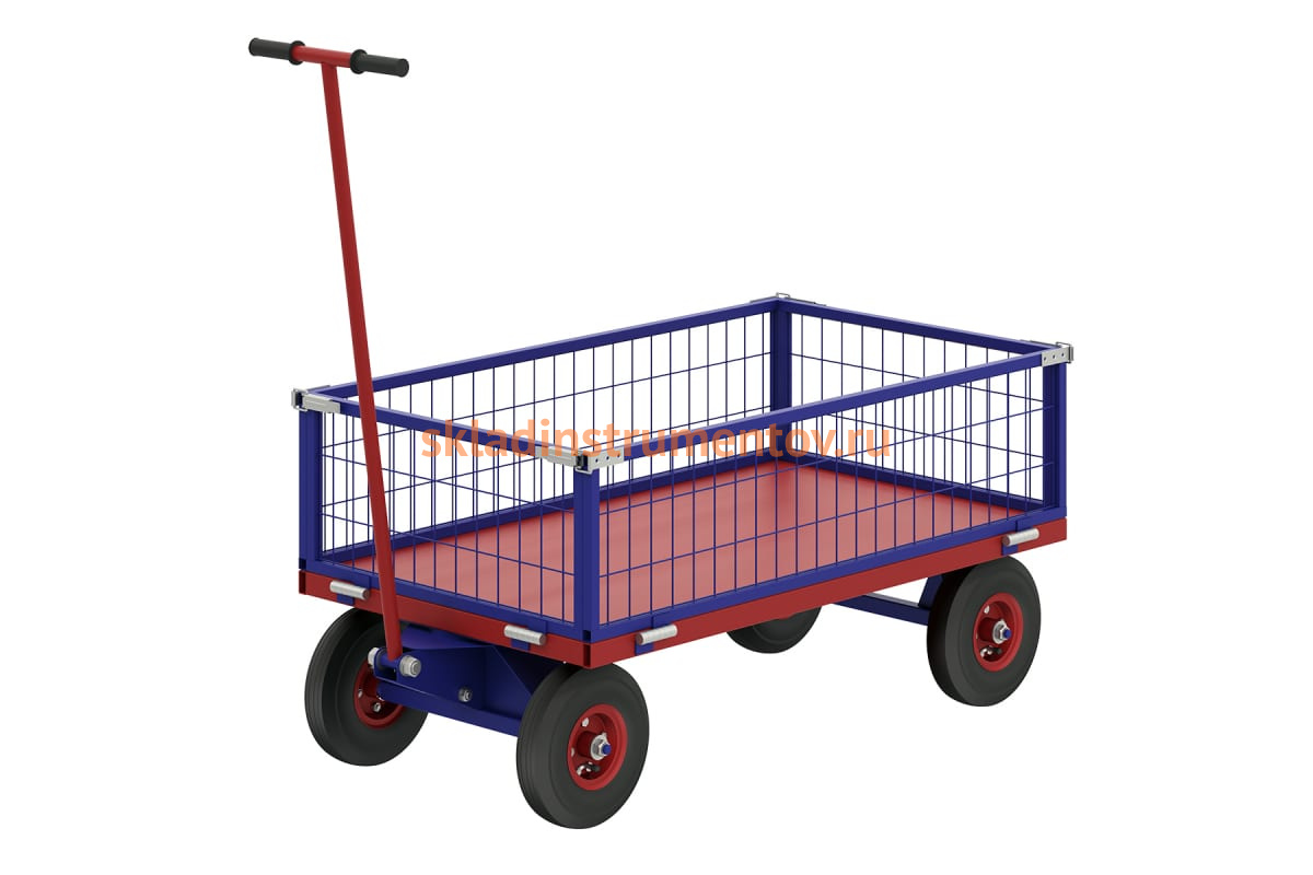 Тележка платформенная с поворотной осью RUSKLAD ТПОБ 2 С (600x900x300) оснащена бортиками из металлической сетки, которые предотвращают скатывание груза с платформы. Изделие способно выдерживать нагрузку до 450 кг. Прочная конструкция обладает четырьмя литыми колесами диаметром 250 мм.