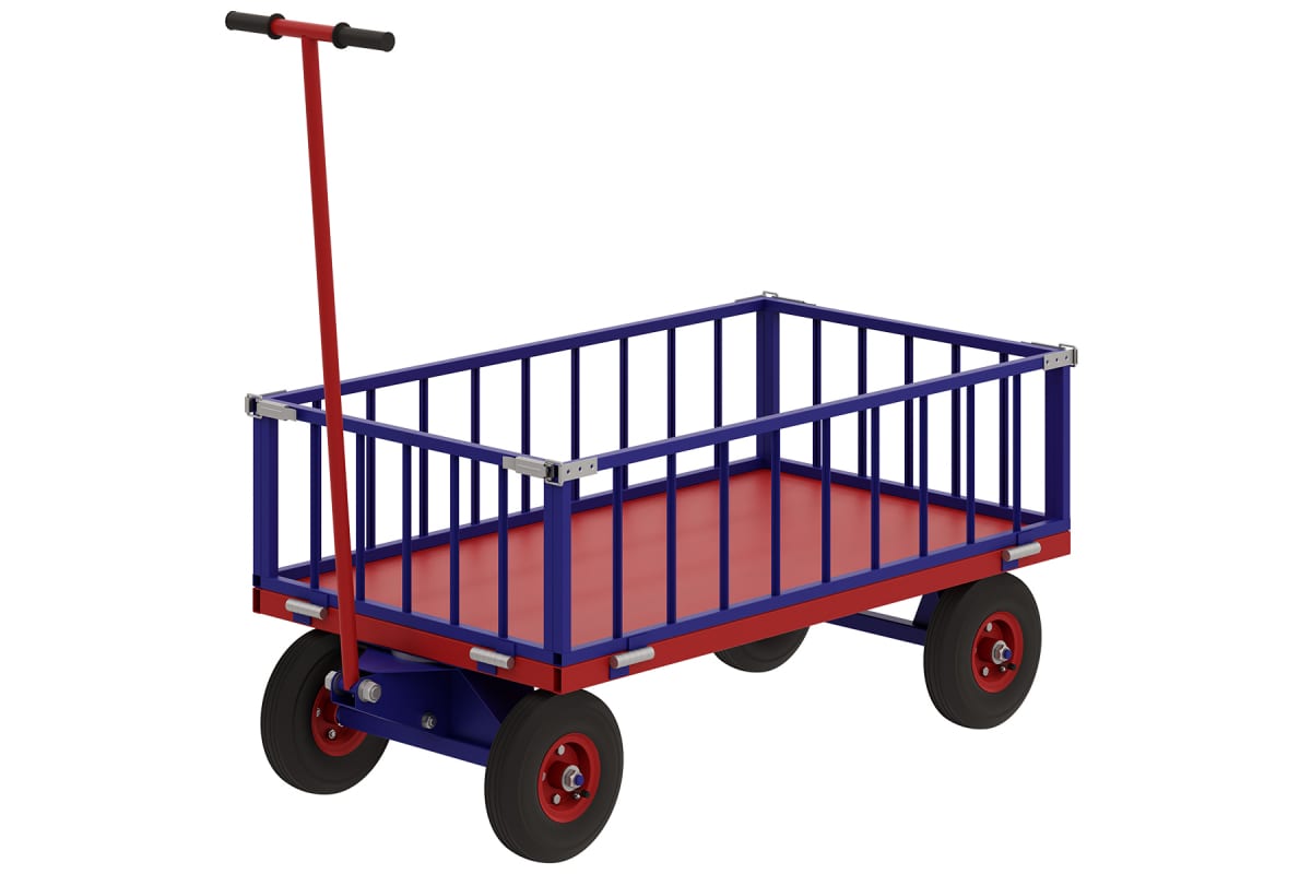 Тележка имеет поворотную ось для удобства разворачивания конструкции. Полимерное порошковое покрытие устойчиво к влиянию коррозии, что дает возможность использовать тележку на открытом воздухе даже при неблагоприятных погодных условиях. Специальные резиновые накладки на рукоятке обеспечивают надежный захват без эффекта проскальзывания рук. Благодаря системе навесом установка и съем бортов осуществляется максимально легко.