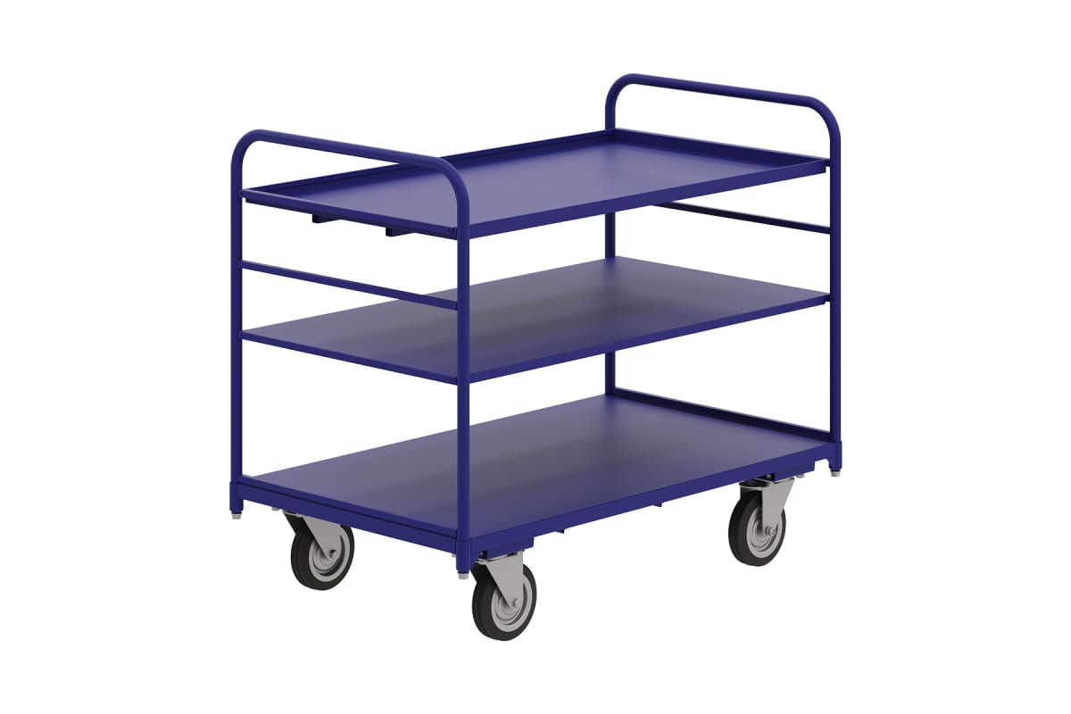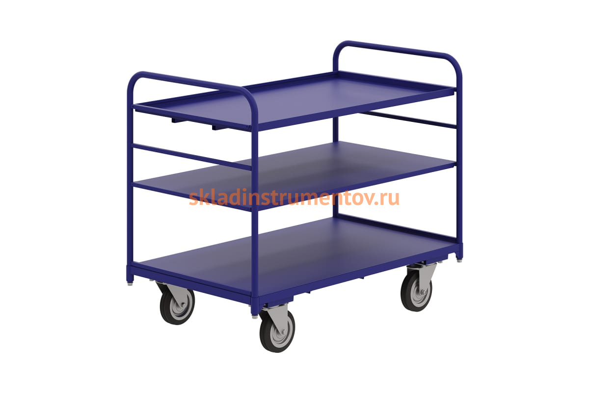 Базовая комплектация тележки: платформа, две ручки. Три горизонтальные перемычки позволяют установить максимальное количество полок — 3 шт., так же дополнительно тележка может комплектоваться: полкой плоской марки ПП,полкой с бортиком марки ПБ.