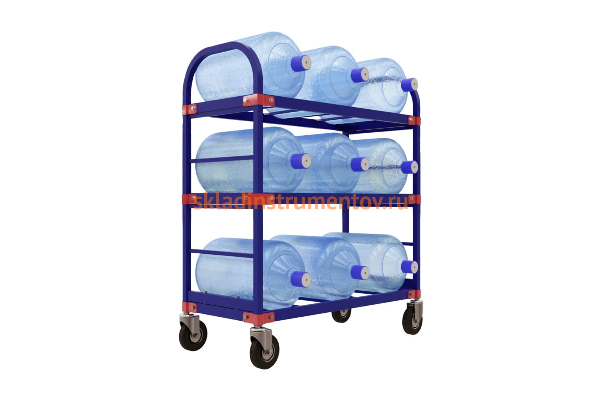 Тележка для перевозки 9-ти бутылей воды RUSKLAD ТСВД 9 обладает прочной конструкцией и хорошей устойчивостью. Несмотря на значительную высоту за счет расположения 3 бутылей в высоту, тележку сложно перевернуть.