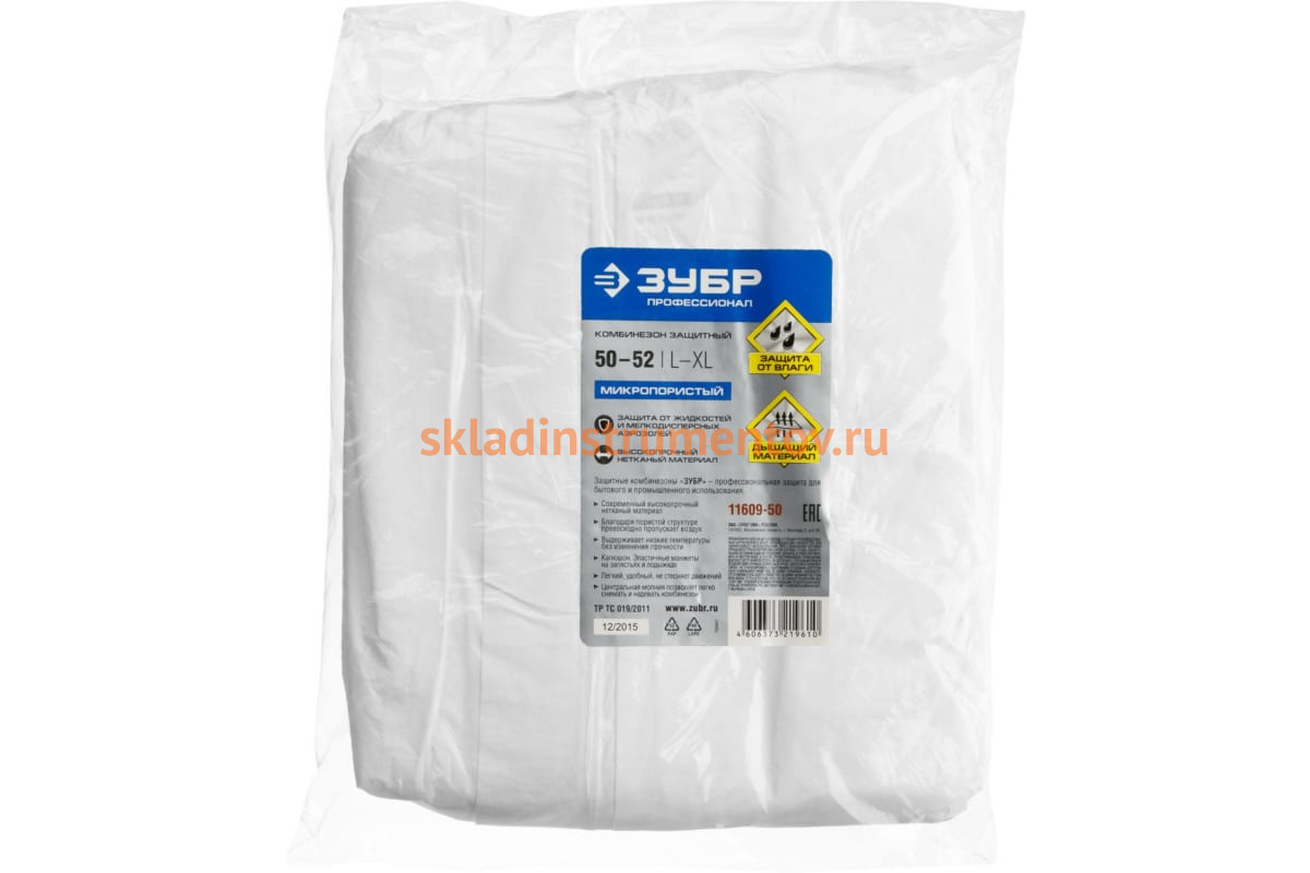 Защитный комбинезон Зубр ПРОФЕССИОНАЛ р. 50-52 11609-50 защищает одежду от общих производственных загрязнений и брызг не разъедающих жидкостей.