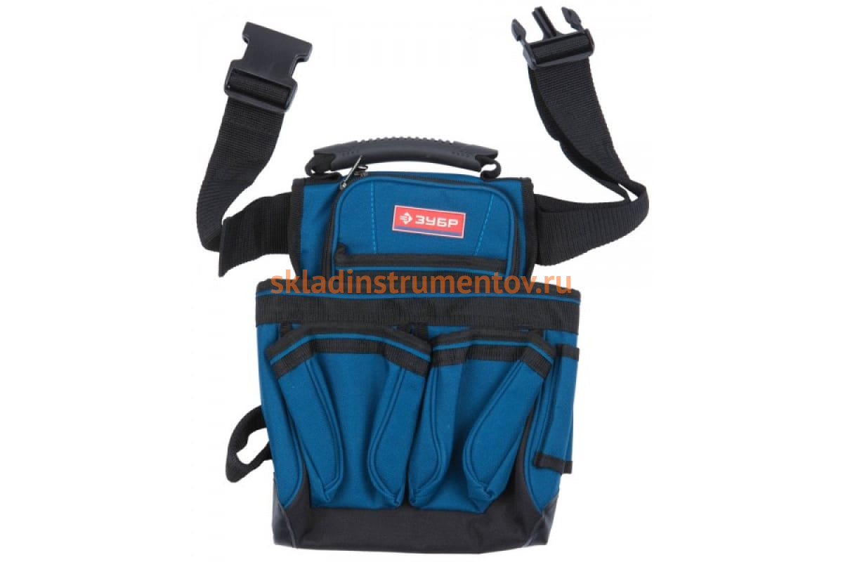 Поясной подсумок Зубр ЭКСПЕРТ держатель для молотка, дополнительная ручка для переноски, 7 карманов 38634 применяется для переноски и хранения ручного инструмента. Востребован при проведении ремонтных и монтажных работ.