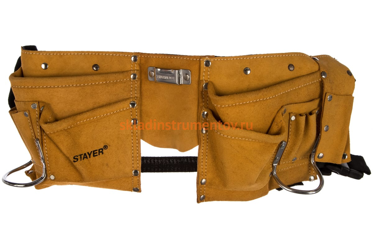 Выполняя монтажные работы, вы сможете положить в карманы ручной инструмент и крепеж. Пояс имеет десять отделений и две скобы, в которых можно закрепить молоток. Пояс изготовлен из натуральной кожи.