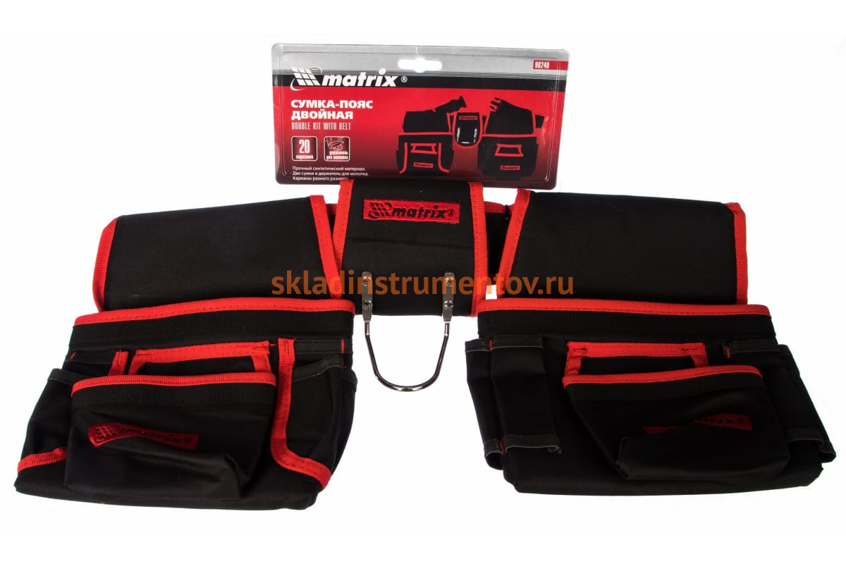 Сумка-пояс двойная MATRIX 90240 предназначена для хранения и транспортировки инструментов. На ремне располагаются две сумки с карманами, а по середине - держатель для молотка. Таким образом, обеспечивается удобный доступ ко всем необходимым приспособлениям в нужное время. Очень полезна в условиях, когда инструмент всегда должен находиться под рукой, например, при монтажных работах. Сумка выполнена из синтетического материала и содержит 20 карманов различного размера, что позволяет хранить в ней большое количество инструментов. Ремень сумки надежно застегивается с помощью пластмассового замка.