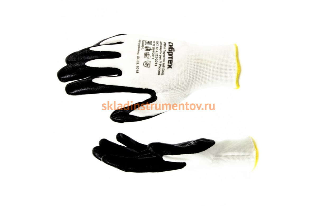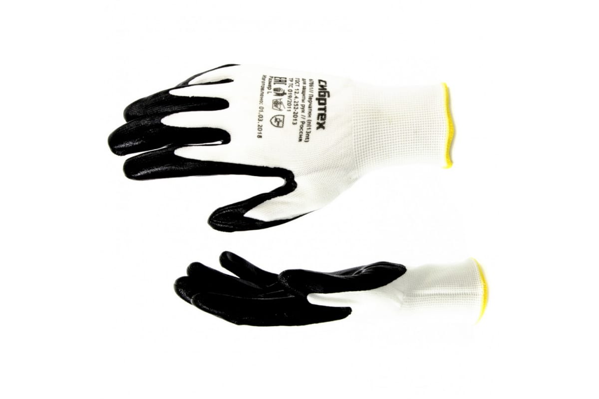 Маслобензостойкие полиэфирные перчатки с черным нитрильным покрытием СИБРТЕХ р.L 67861 предназначены для строительных и хозяйственных работ.