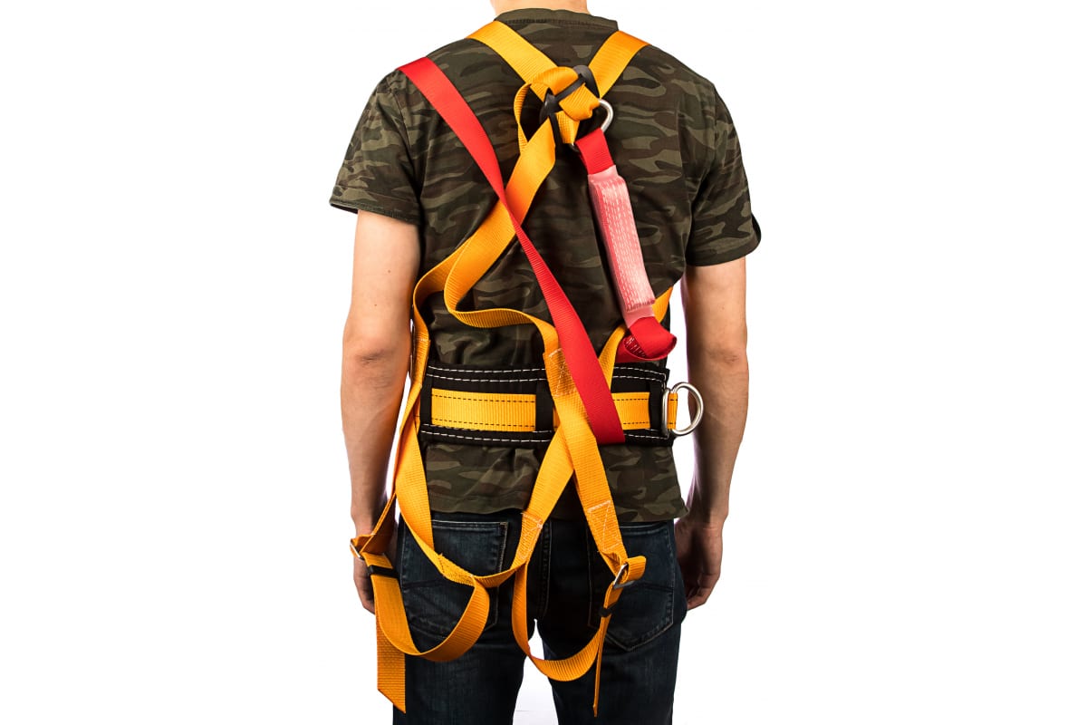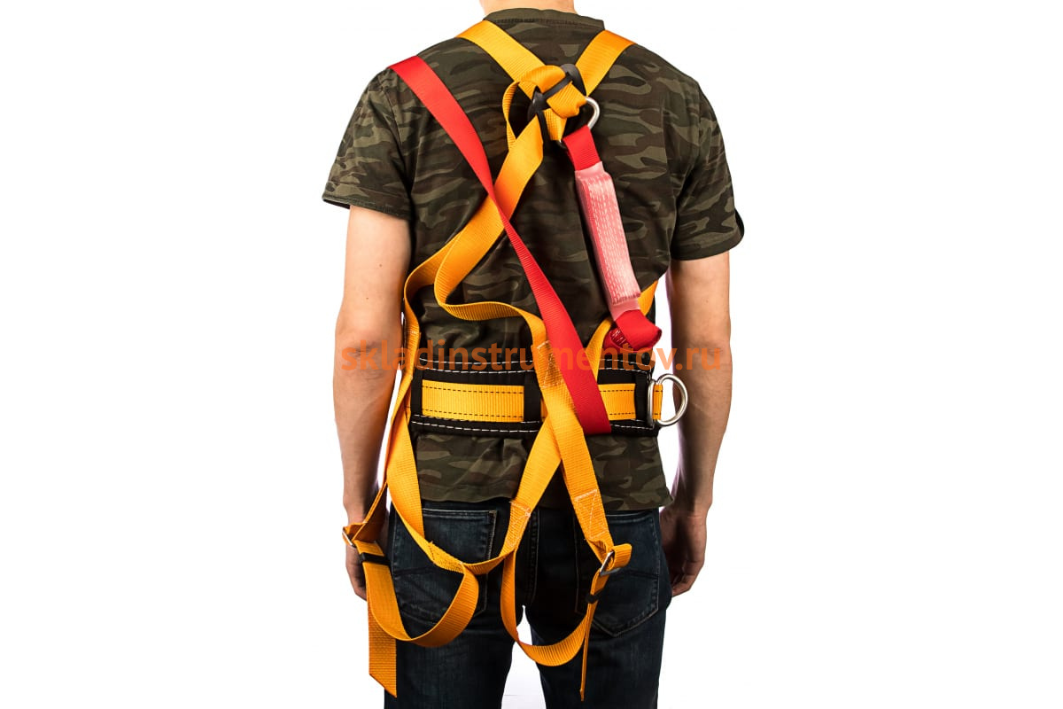 Страховочная система стропом из ленты с амортизатором ПРОГРЕСС СЕФЕТИ УС 2 аАЖ состоит из привязи ремня с пряжкой, набедренных и наплечных лямок, кушака, одного D-кольца на спине и двух - на поясе и страховочного стропа с амортизатором. Данная модель обеспечивает надежную защиту от падения во время высотных работ.