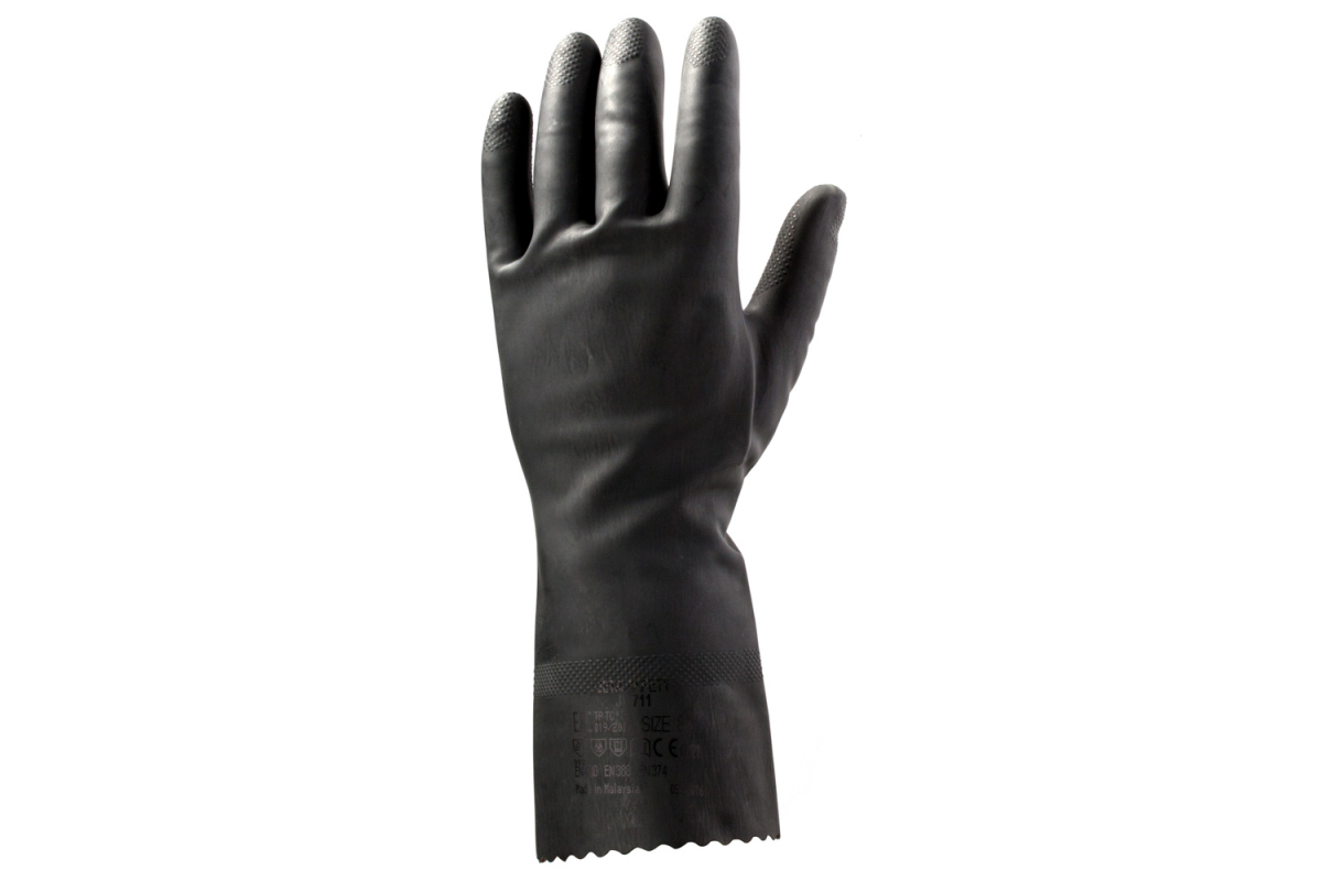 Латексные химически стойкие перчатки Jeta Safety размер 10/XL JL711-XL защищают руки при работе с водорастворимыми неорганическими кислотами (до 50%) и щелочами (до 40%).